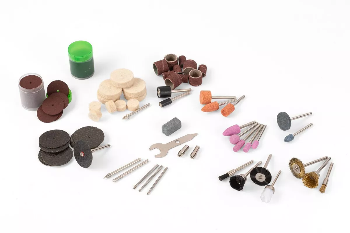 - I když je stroj vybaven ochrannými kryty, doporučuje se vždy nosit také ochranné brýle. Kufřík s příslušenstvím: 1x kombinovaný klíč, 2 x kleština (2 – 3,2 mm), 1x leštící pasta, 1 x obvazový kámen (20 x 10 x 10 mm), 12 x řezný kotouč (32 x 1 mm), 40 x řezný kotouč (prům.24 mm), 5 x brusný pás (13 mm, prům.15 mm), 5 x brusný pás (13 mm, prům.9 mm), 5 x leštící plsť (prům.25 x 7 mm), 5 x leštící plsť (prům.13 x 7 mm), 10 x bit brusného kamene (ve tvaru tužky), 5x fréza,4x čistící kartáček, 3x mosazný kartáč, 2 x trn pro brusný pás, 2 x trn na leštění plsti/řezný kotouč