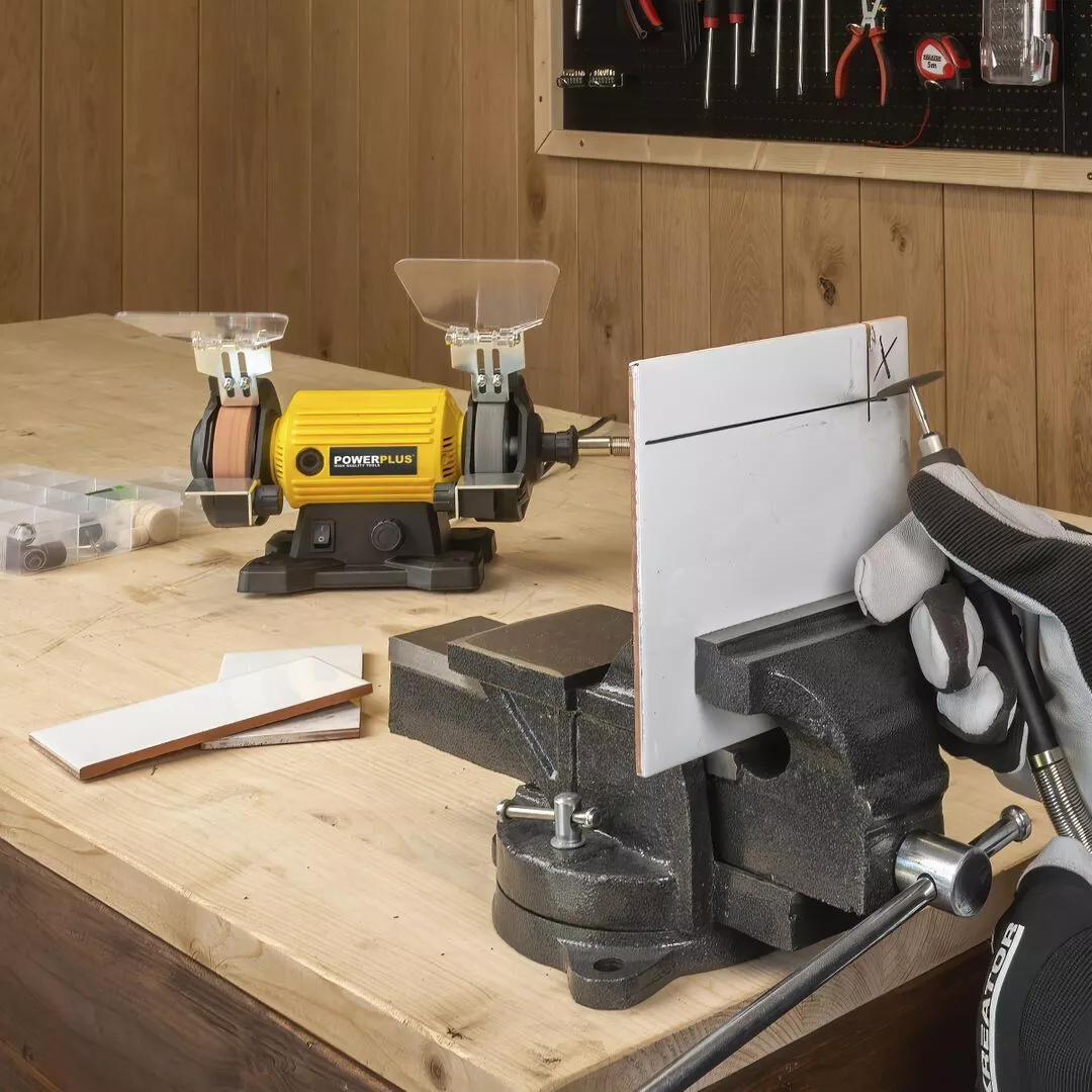 - Použijte stolní brusku k broušení, leštění, broušení a čištění různých materiálů, jako je kov, dřevo a plast.