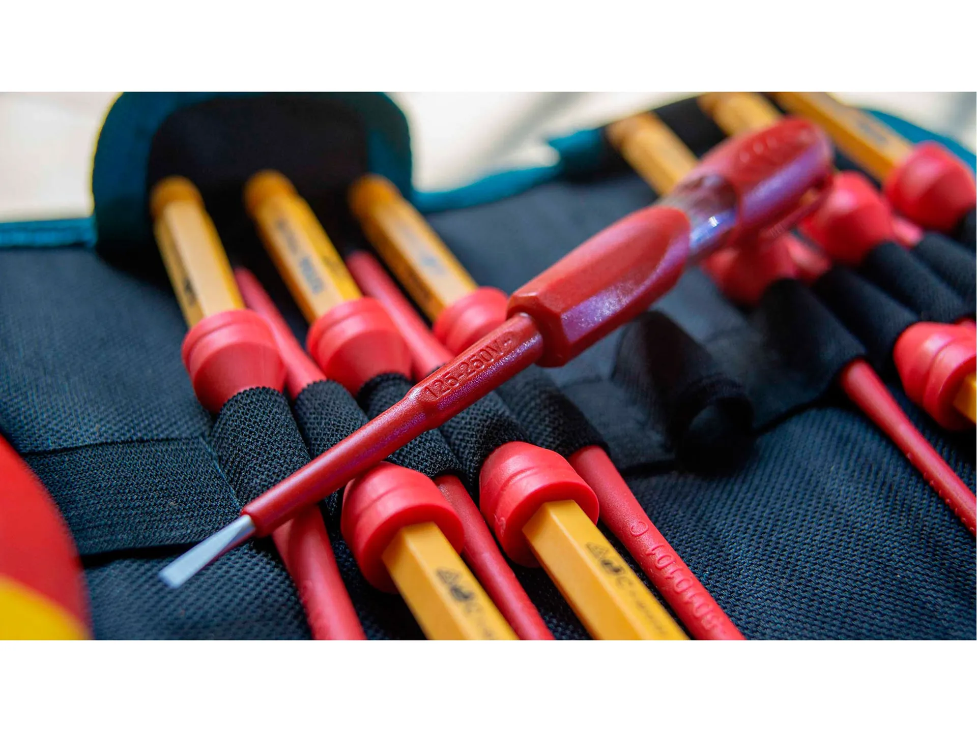 - 12 dílná sada elektrikářských šroubováků s vyměnitelnou rukojetí a jedním kusem zkoušečky napětí. 1000V, VDE/GS certifikace.