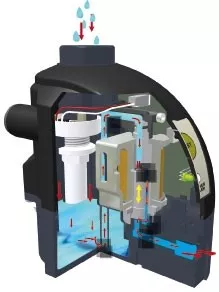 - Pokud je hladina dostatečně vysoko, dojde k vypuštění kondenzátu ze systému bez tlakových ztrát