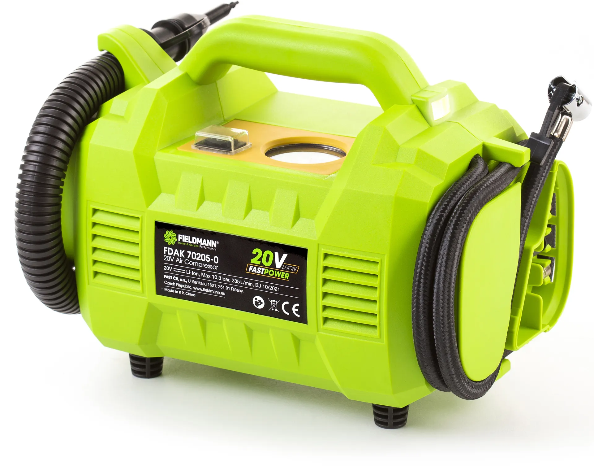 - Akumulátorový kompresor Fieldmann FDAK 70205-0 s maximálním výstupním tlakem 10,3 bar a průtokem vzduchu 235 l/min. Vybaven je ergonomickým držadlem pro snadné přenášení. Nabíječka a baterie nejsou součástí balení.