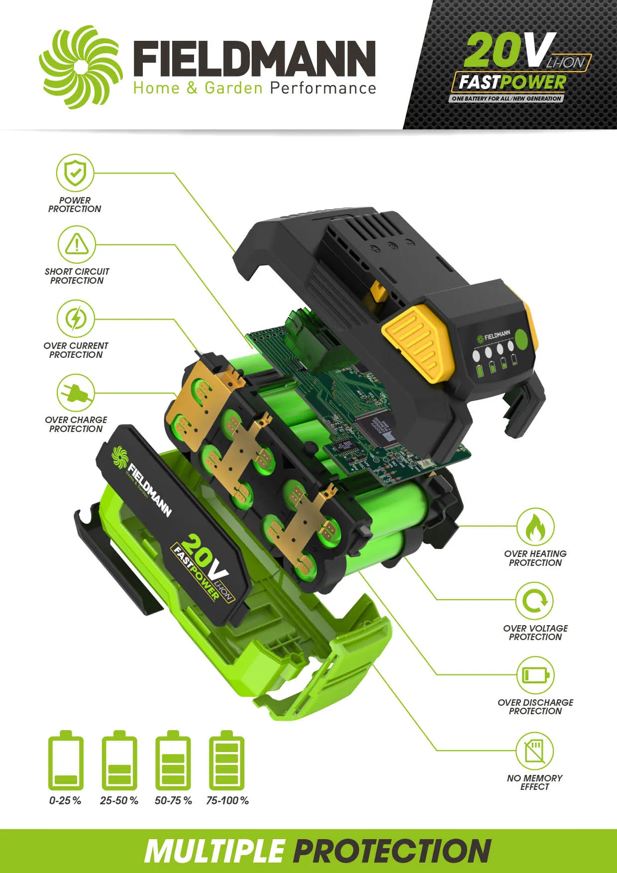 - Li-Ion akumulátor renomované značky FIELDMANN představuje opravdovou špičku ve své kategorii. Je kompatibilní se všemi stroji řady AKU FAST POWER 20V. Pro tento druh akumulátoru je typická extrémně dlouhá životnost i výdrž a především vyrovnaný výkon po celou dobu životního cyklu spolu s nízkou vahou.
