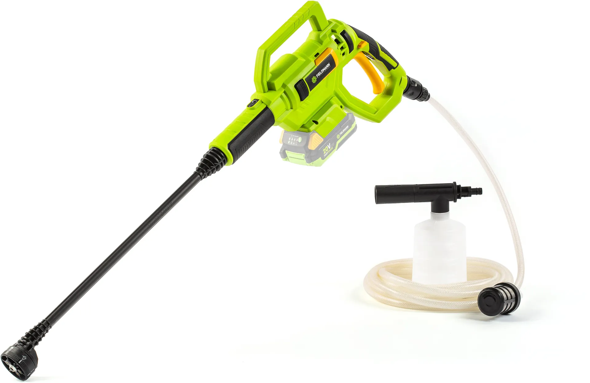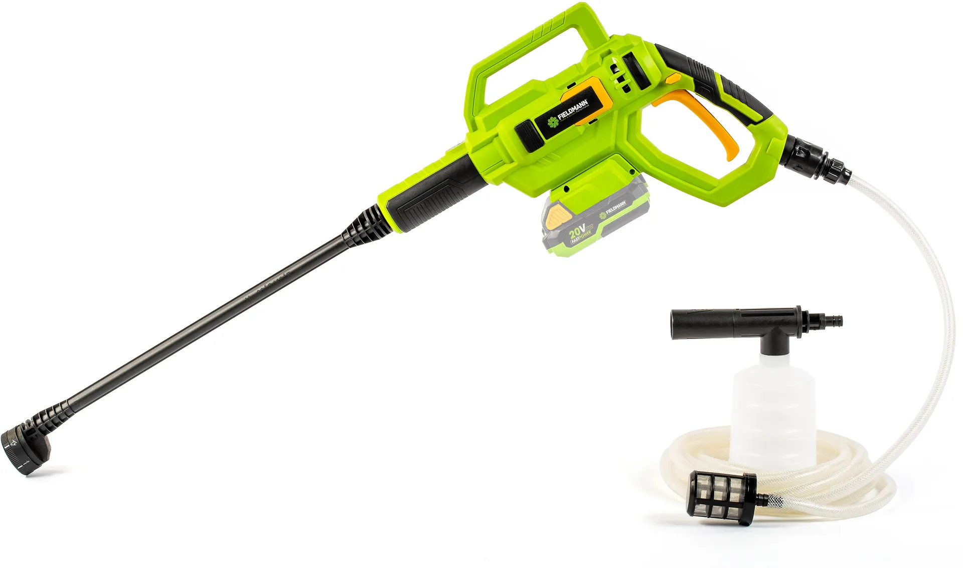- Tato akumulátorová tlaková myčka renomované značky FIELDMANN je ideální pro použití na Vašich cestách. Stroj o výkonu 20 V je vybaven dostatečně dlouhou samonasávací hadicí, která může čerpat vodu z zůzných zdrojů, jako je jezero, studna nebo kyblík s vodou, proto se tento stroj dokonale hodí k čištění silničních nebo horských kol po blátivé jízdě. Přenosný vysokotlaký čistič lze také připojit k běžnému vodovodnímu řádu pomocí standardní zahradní hadice. Tlakový čistič je vybaven výkonným motorem, který zaručuje dostatečný tlak pro všestranné mytí, Myčka má průtok 150 litrů za hodinu s maximálním tlakem vody 25 barů. Přepínání mezi nízkým a vysokým tlakem je snadné pomocí tlačítka na těle stroje. . Tlaková tryska 5 v 1 nabízí 5 různých způsobů stříkání, od běžného vodního paprsku po silný přesný paprsek. Extra čistých výsledků lze dosáhnout díky nádrži na čisticí prostředek. Lze jej snadno připevnit a poskytuje dokonale čisté výsledky. Použít můžete baterie z řady FAST POWER 20V. Stroj je dodávaný bez baterie a nabíječky