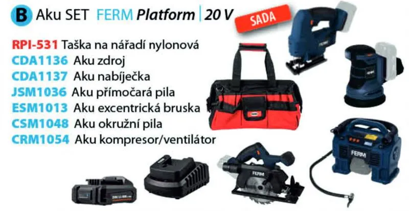 - Ferm aku sada nářadí B, taška RPI-531, přímočará pila JSM1036, excentrická bruska ESM1013, okružní pila CSM1048, kompresor CRM1054, zdroj 2.0Ah CDA1136, nabíječka CDA1137