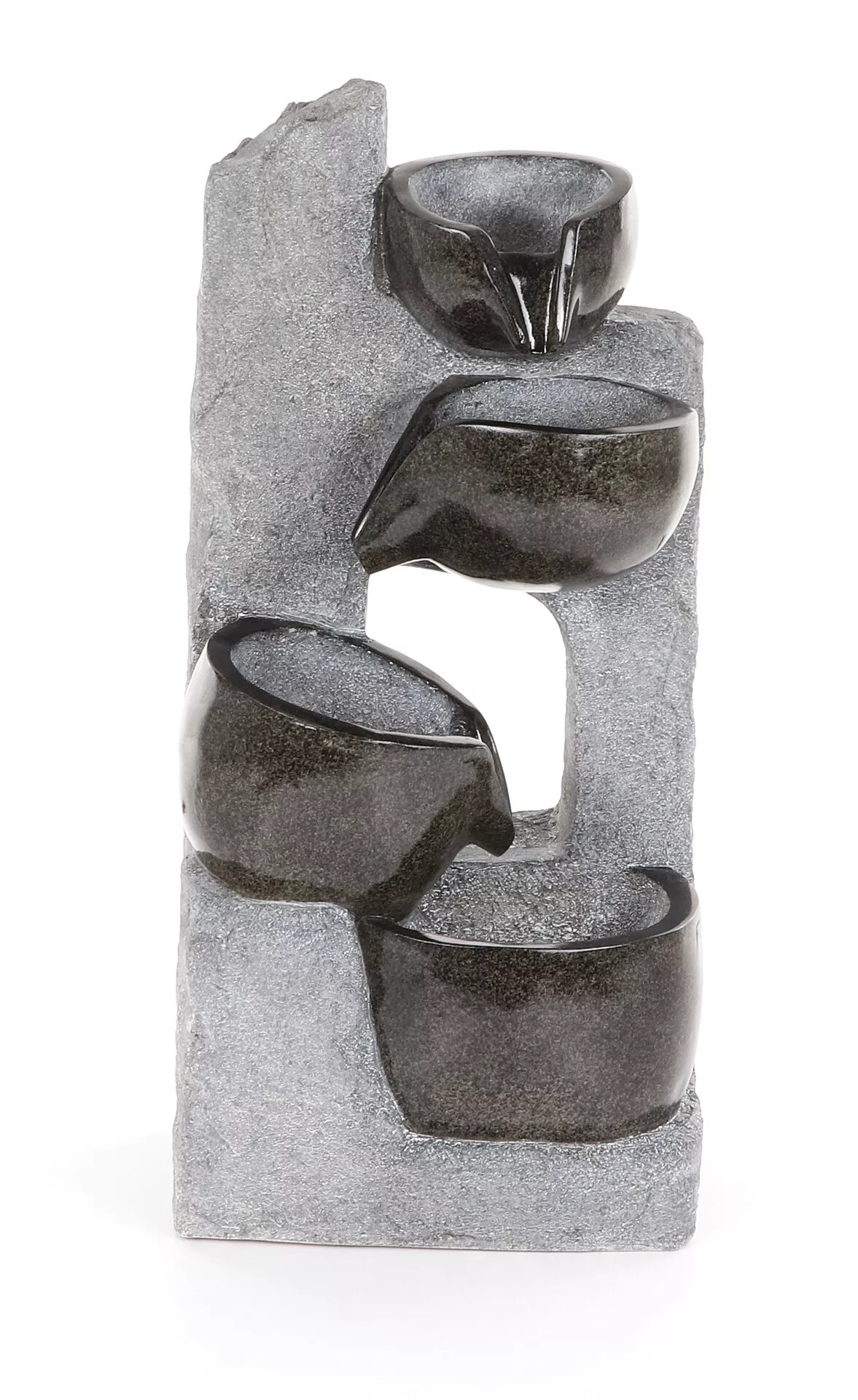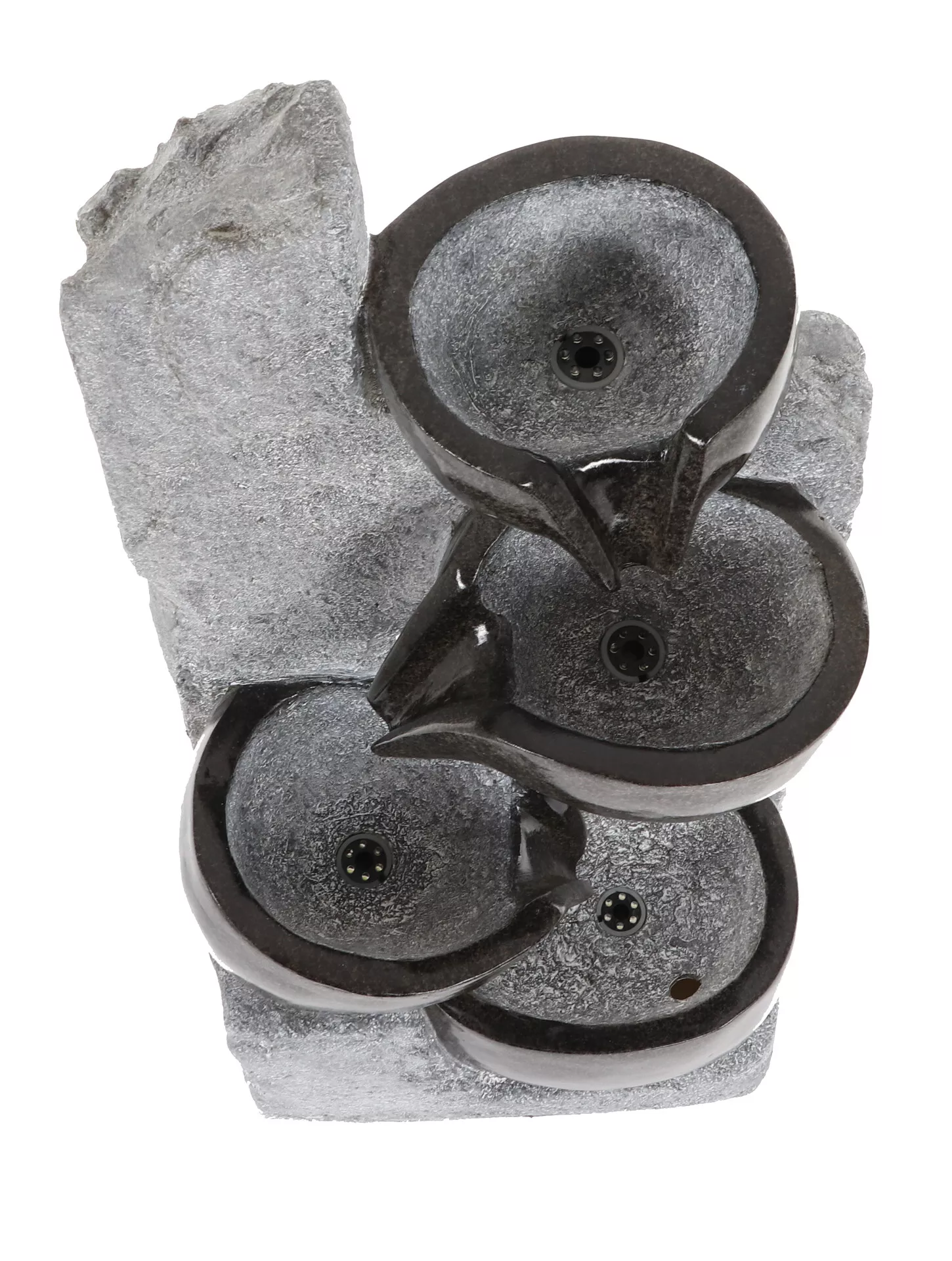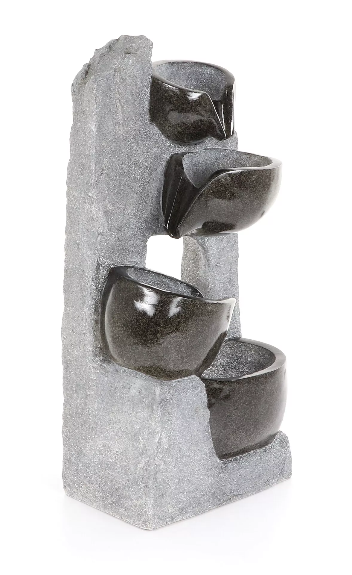 - Zahradní fontána je vybavena kvalitní a velmi tichou vodní pumpou. Voda stéká po jednotlivých miskách, misky jsou prosvětleny LED osvětlením.