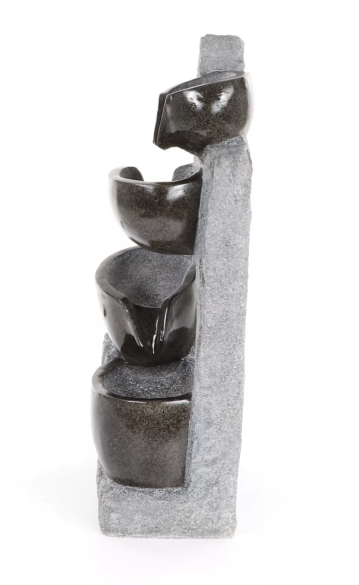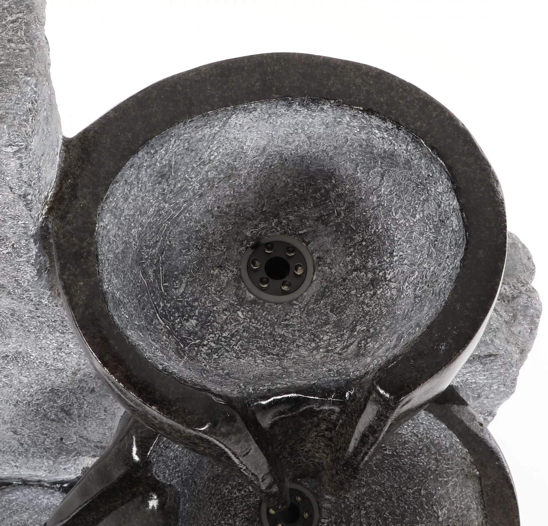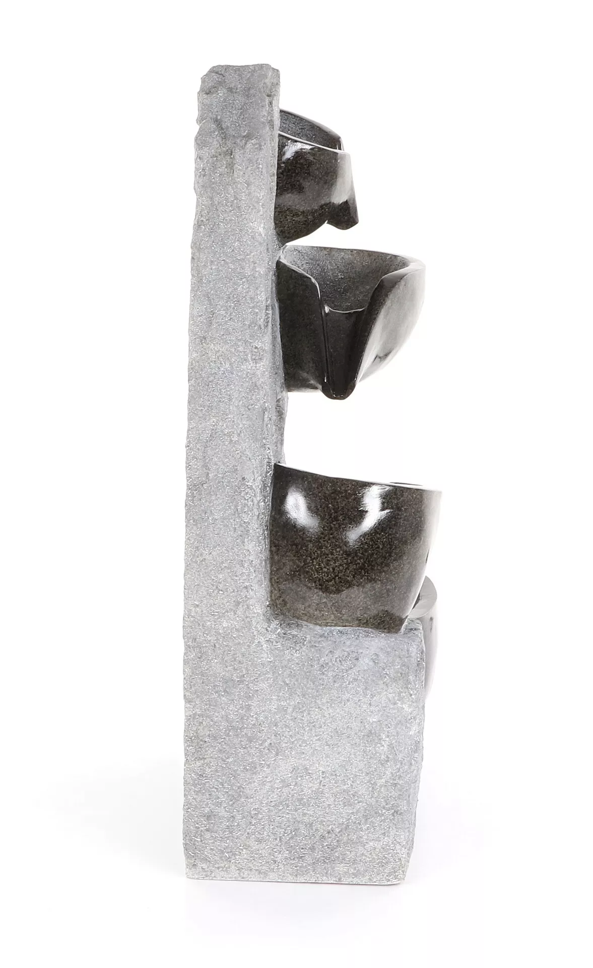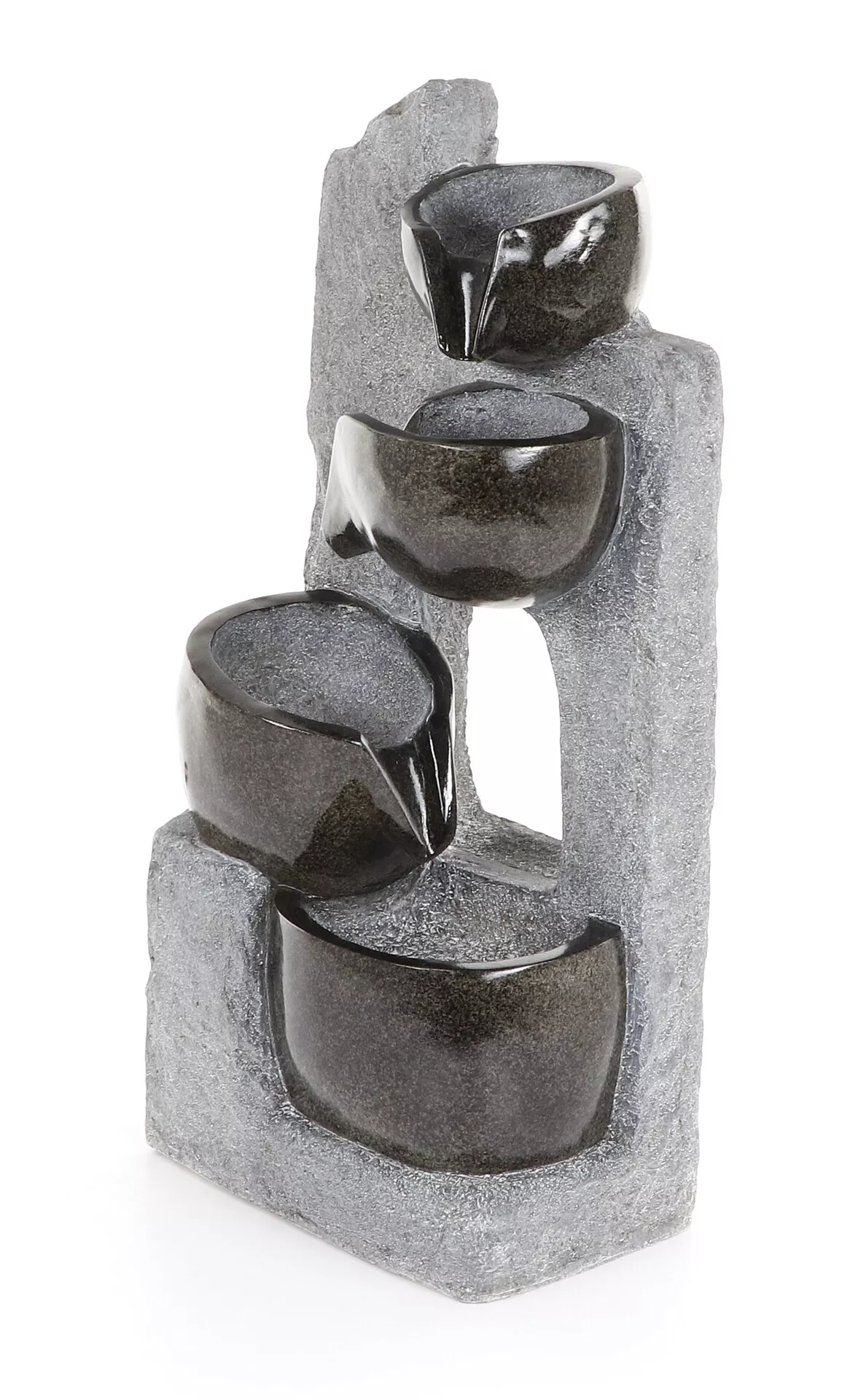 - Zahradní fontána je vybavena kvalitní a velmi tichou vodní pumpou. Voda stéká po jednotlivých miskách, misky jsou prosvětleny LED osvětlením.