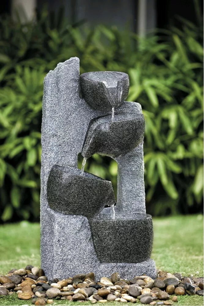 - Zahradní fontána s přelévajícími se kamennými miskami s LED osvětlením bude rozhodně příjemnou oázou klidu a pohody ve Vaší zahradě.