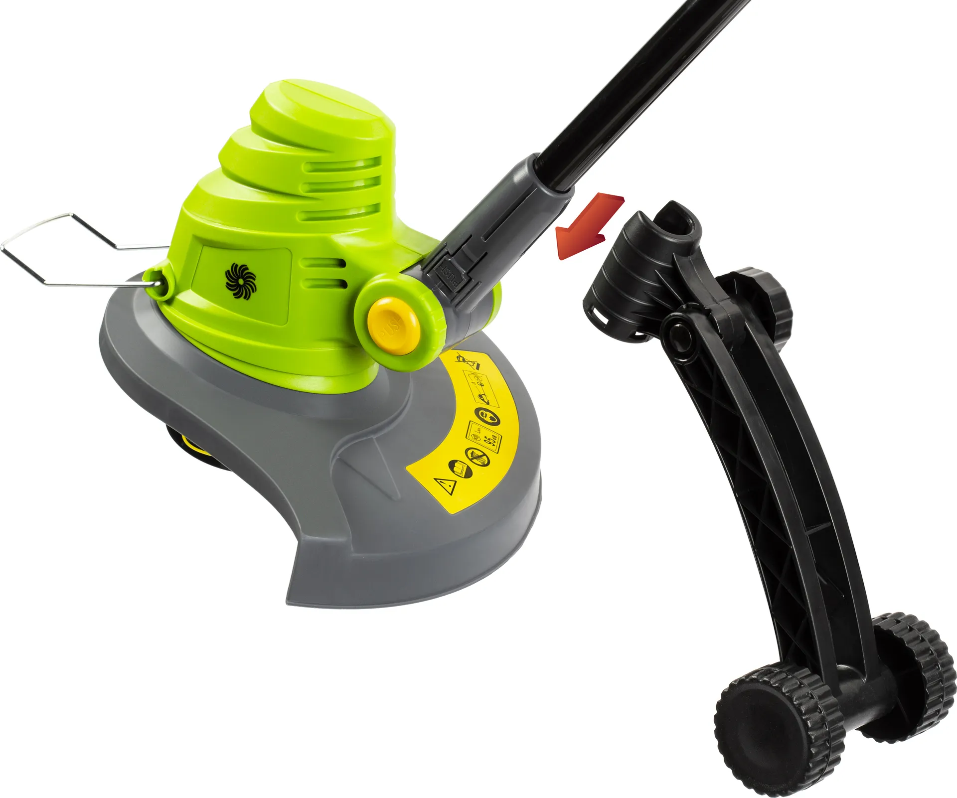 - Strunová sekačka, kolečka, žací hlava se strunou, rukojeť, umělohmotný kryt, sada pro montáž