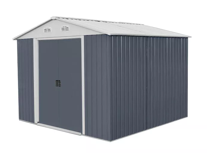 - Kvalitní zahradní domek s odolnou konstrukcí v kombinaci šedé a tmavě šedé barvy.