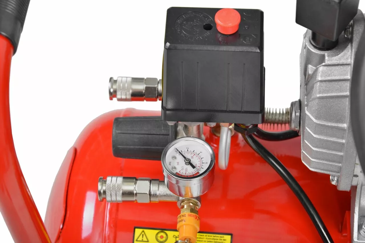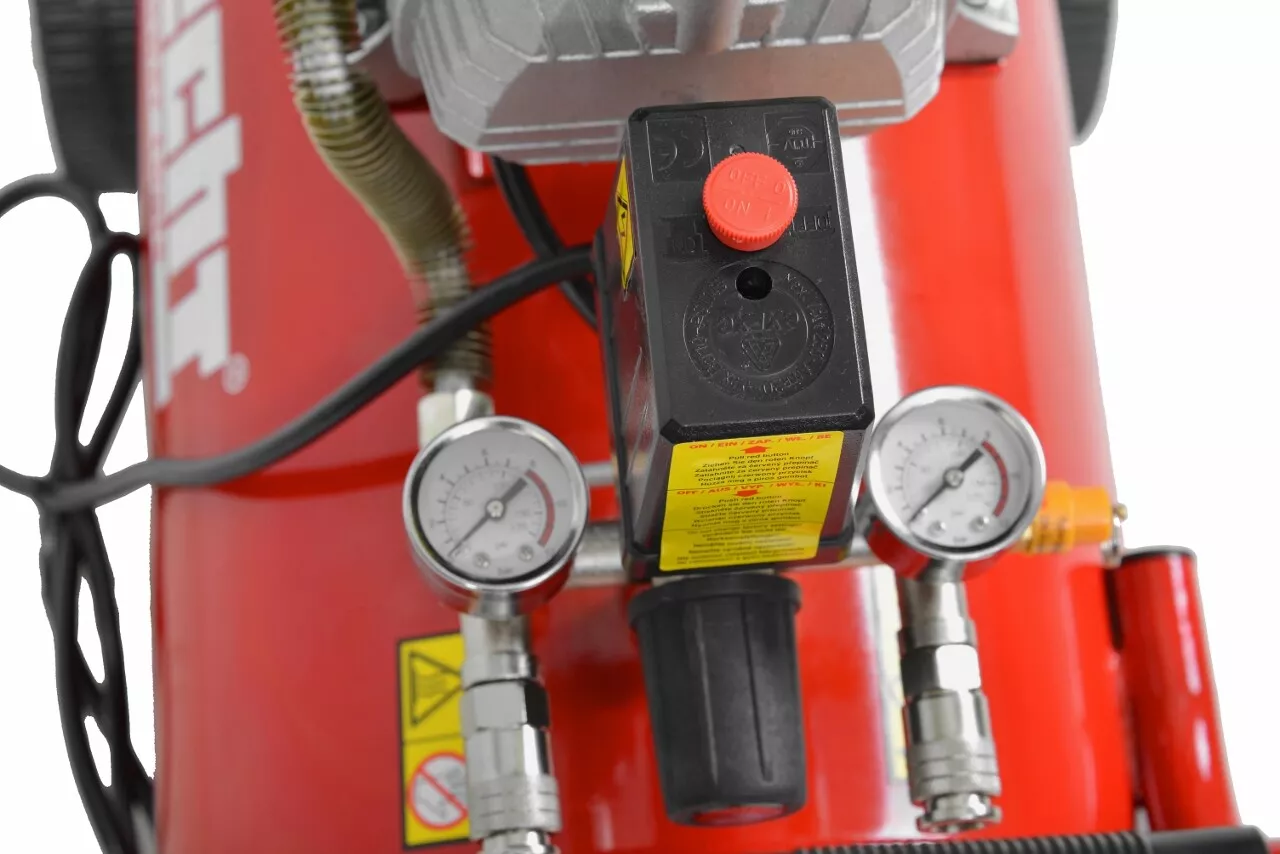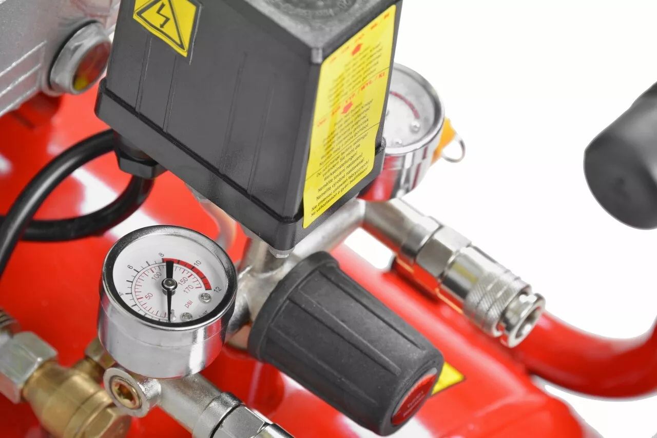 - Kompresor je vybaven optickým ukazatelem stavu oleje, dvojicí manometrů a rychlospojek pro připojení až dvou hadic.