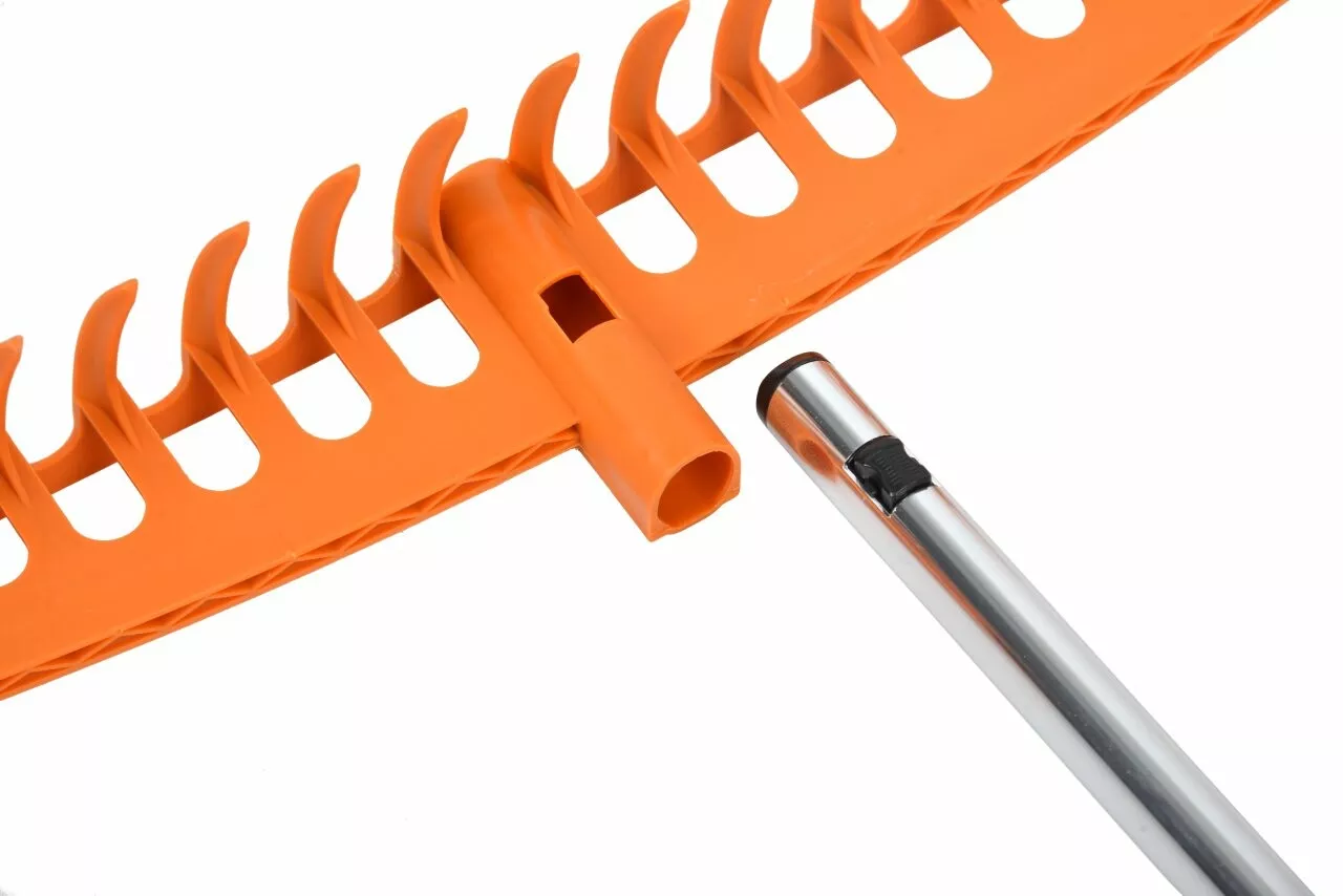• Zajištění hrábí na násadě je řešeno malou západkou, hrábě jen nasunete, zajistíte a v případě potřeby jejich výměny opět snadno uvolníte a sejmete, je tak možné je snadno na násadě měnit.