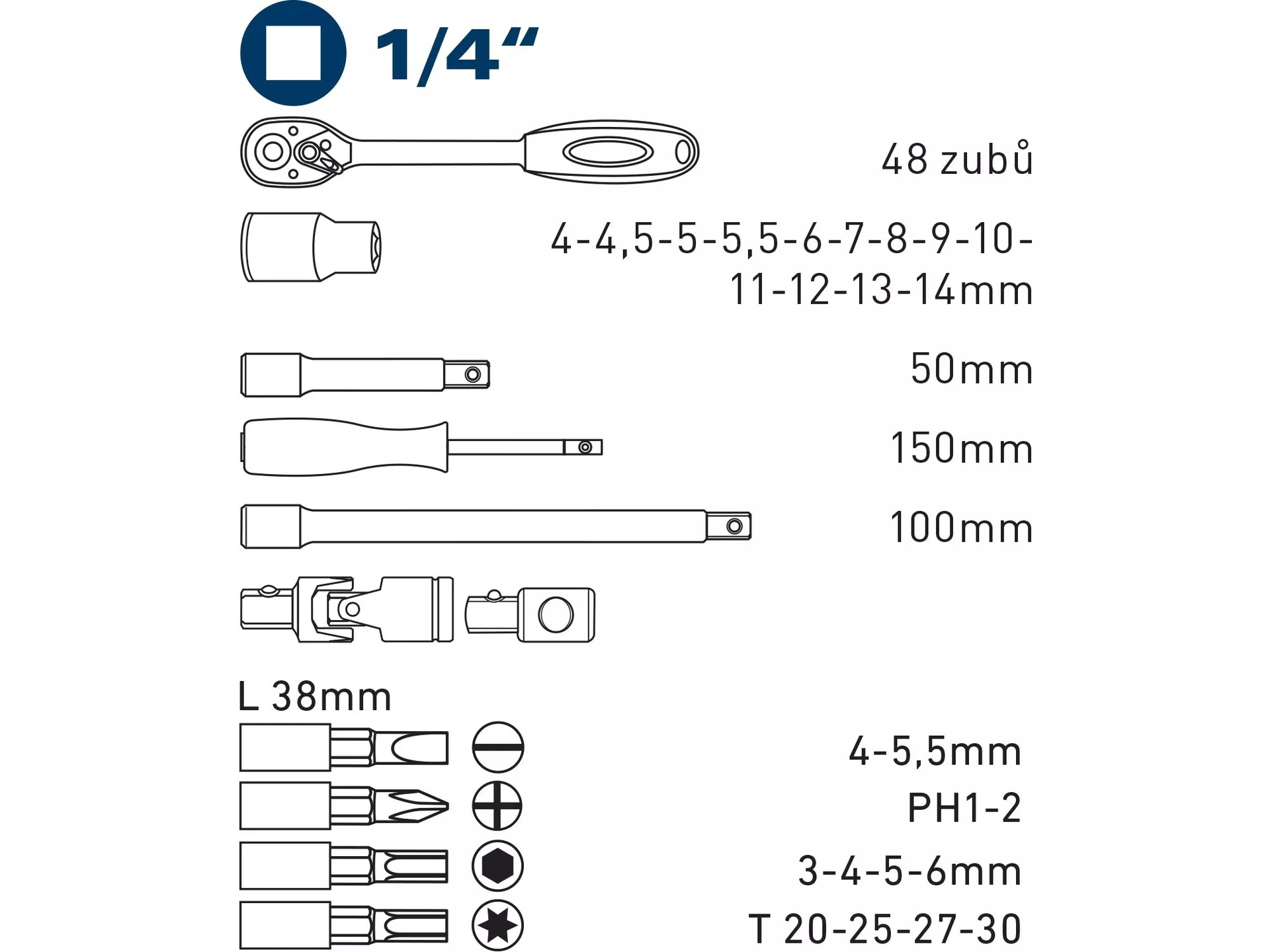 - Hlavice nástrčné: 1/4": 4-5-6-7-8-9-10-11-12-13-14mm