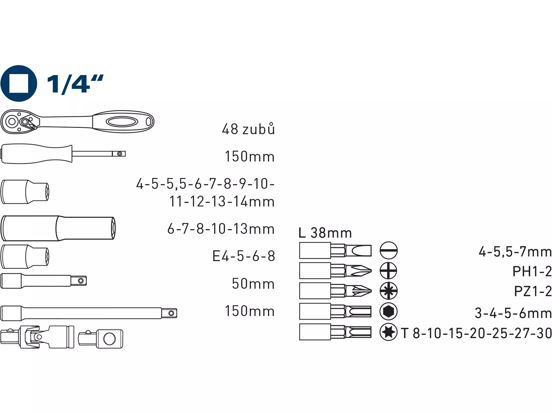 - Hlavice nástrčné: 1/4": 4-5-6-7-8-9-10-11-12-13-14mm