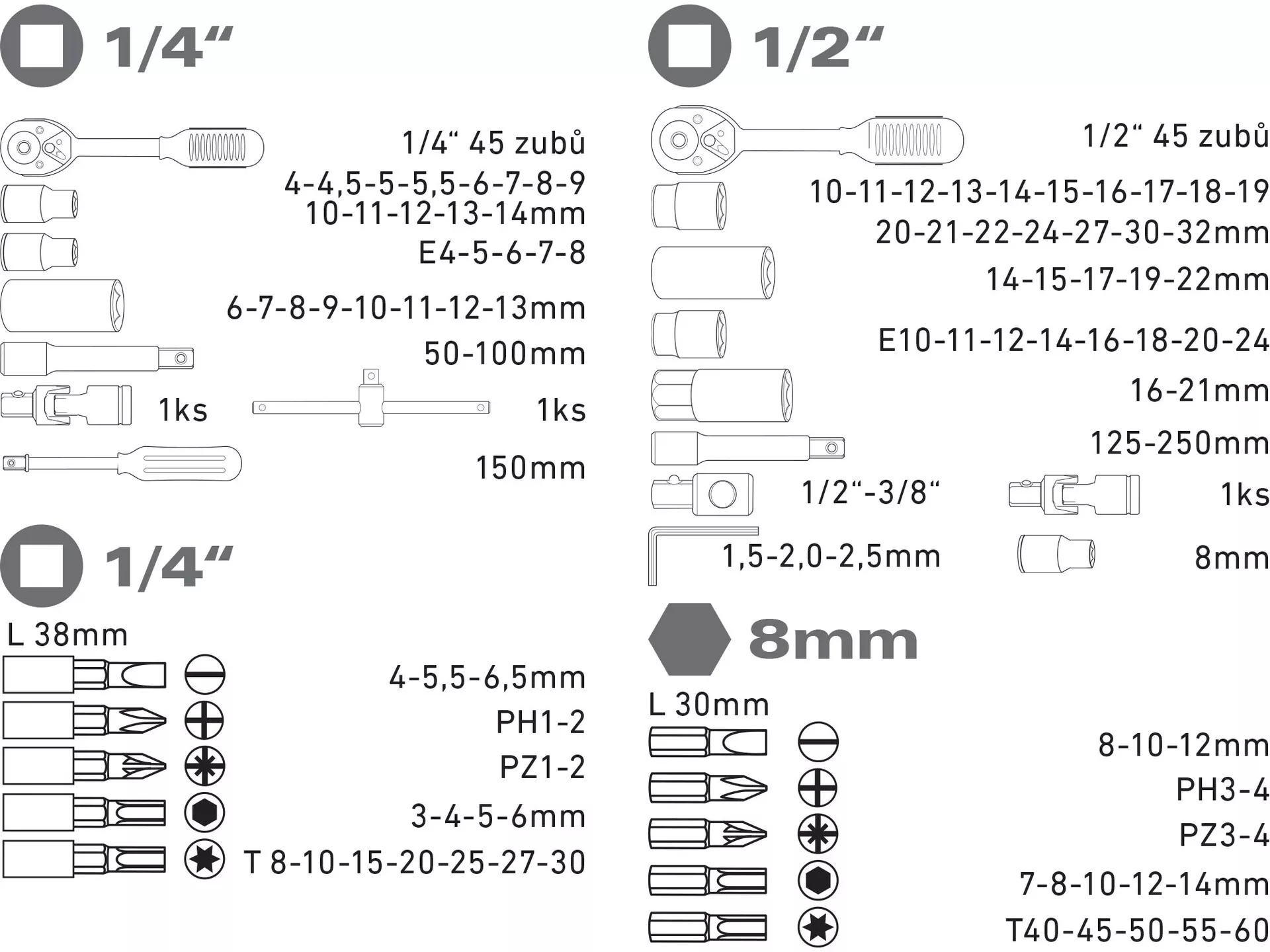 - Hlavice zástrčné: 1/4": (-) 4-5,5-6,5mm, PH1-2, PZ1-2, H3-4-5-6, T8-10-15-20-25-27-30