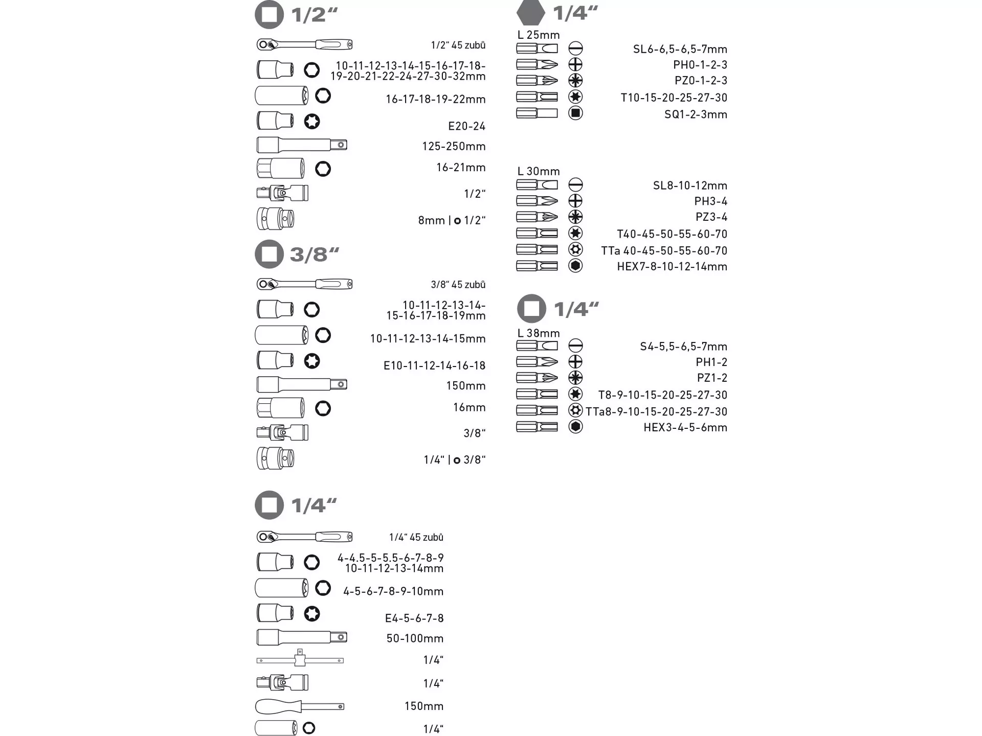 - Hlavice nástrčné: 1/4": 4-4,5-5-5,5-6-7-8-9-10-11-12-13-14mm, 1/2": 10-11-12-13-14-15-16-17-18-19-20-21-22-23-24-27-30-32mm