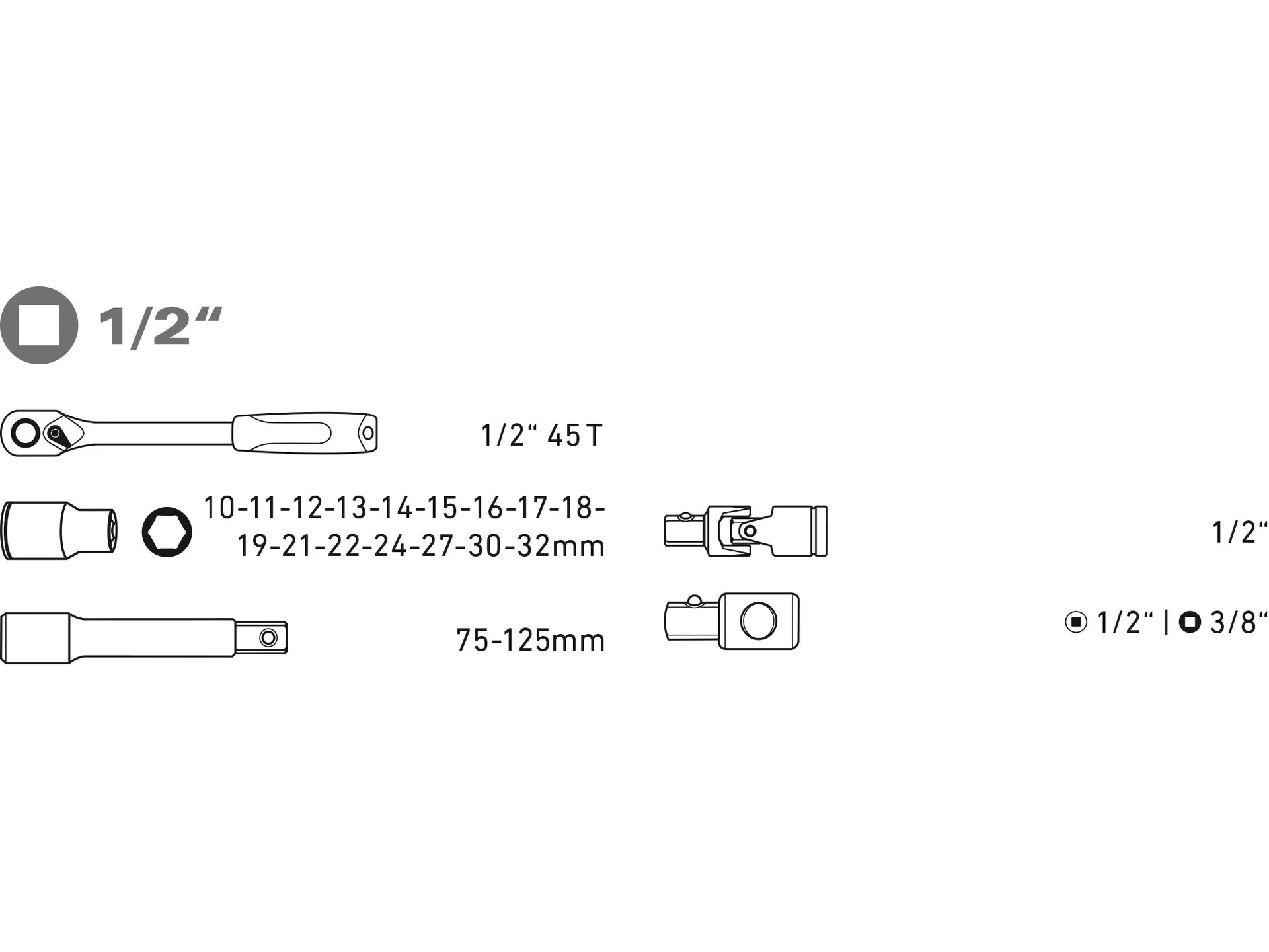 - Hlavice nástrčné: 1/4": 4-4,5-5-5,5-6-7-8-9-10-11-12-13-14mm, E4-5-6-7-8; 1/2": 10-11-12-13-14-15-16-17-18-19-20-21-22-23-24-27-30-32mm, E10-11-12-14-16-18-20-24