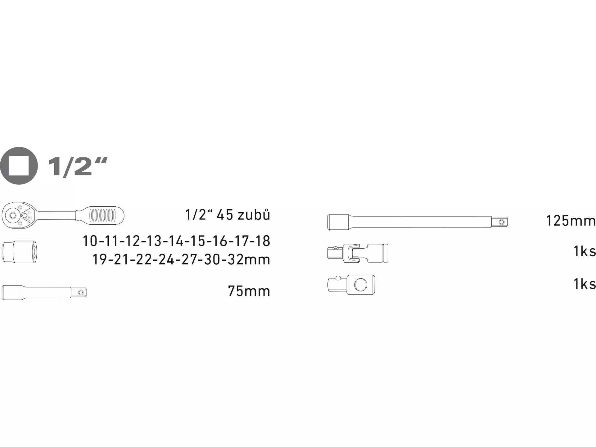 - Hlavice nástrčné: 1/4": 4-4,5-5-5,5-6-7-8-9-10-11-12-13-14mm, E4-5-6-7-8; 1/2": 10-11-12-13-14-15-16-17-18-19-20-21-22-23-24-27-30-32mm, E10-11-12-14-16-18-20-24