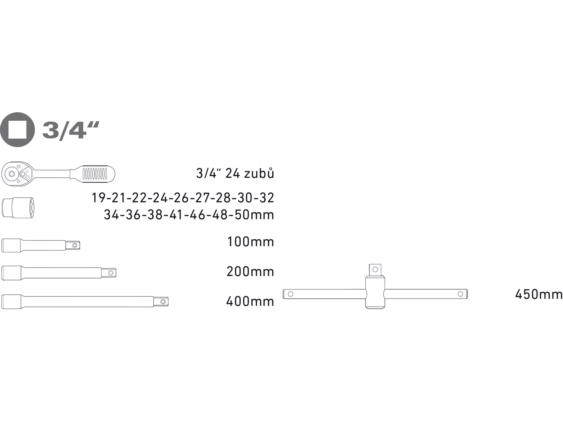 - Hlavice nástrčné: 3/4": 19-21-22-24-26-27-28-30-32-34-36-38-41-46-48-50mm