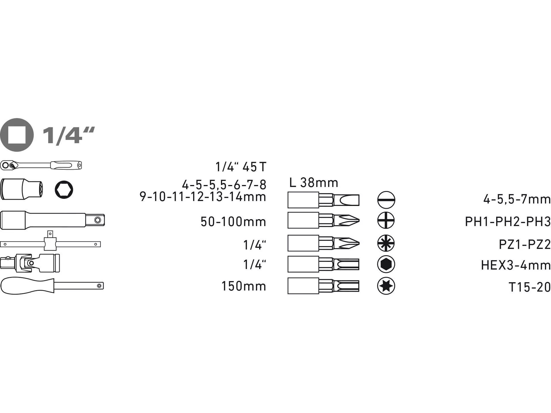 - Hlavice nástrčné: 1/4": 4-5-6-7-8-9-10-11-12-13-14mm