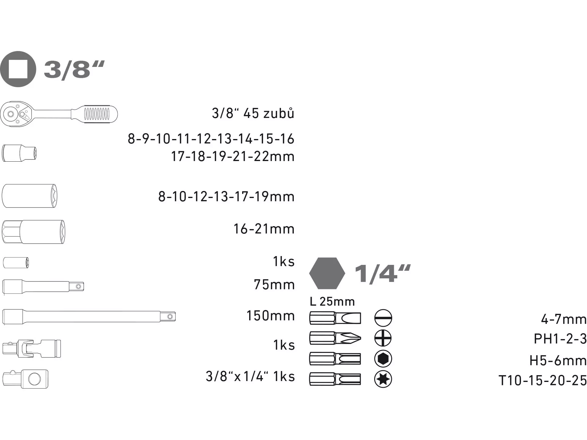 - Hlavice nástrčné: 1/4": 4-5-6-7-8-9-10-11-12-13-14mm