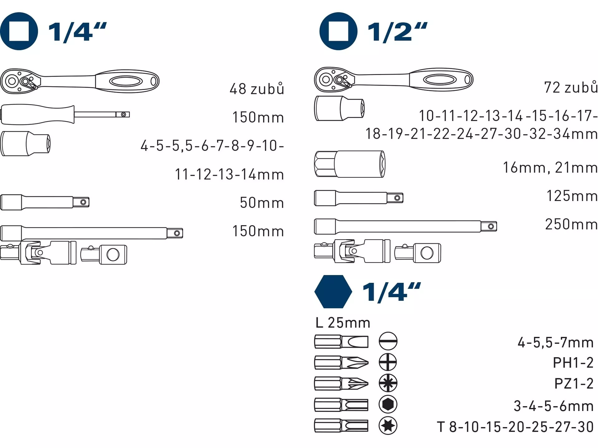 - Hlavice nástrčné: 1/4": 4-5-5,5-6-7-8-9-10-11-12-13-14mm, 1/2": 10-11-12-13-14-15-16-17-18-19-21-22-24-27-30-32-34mm