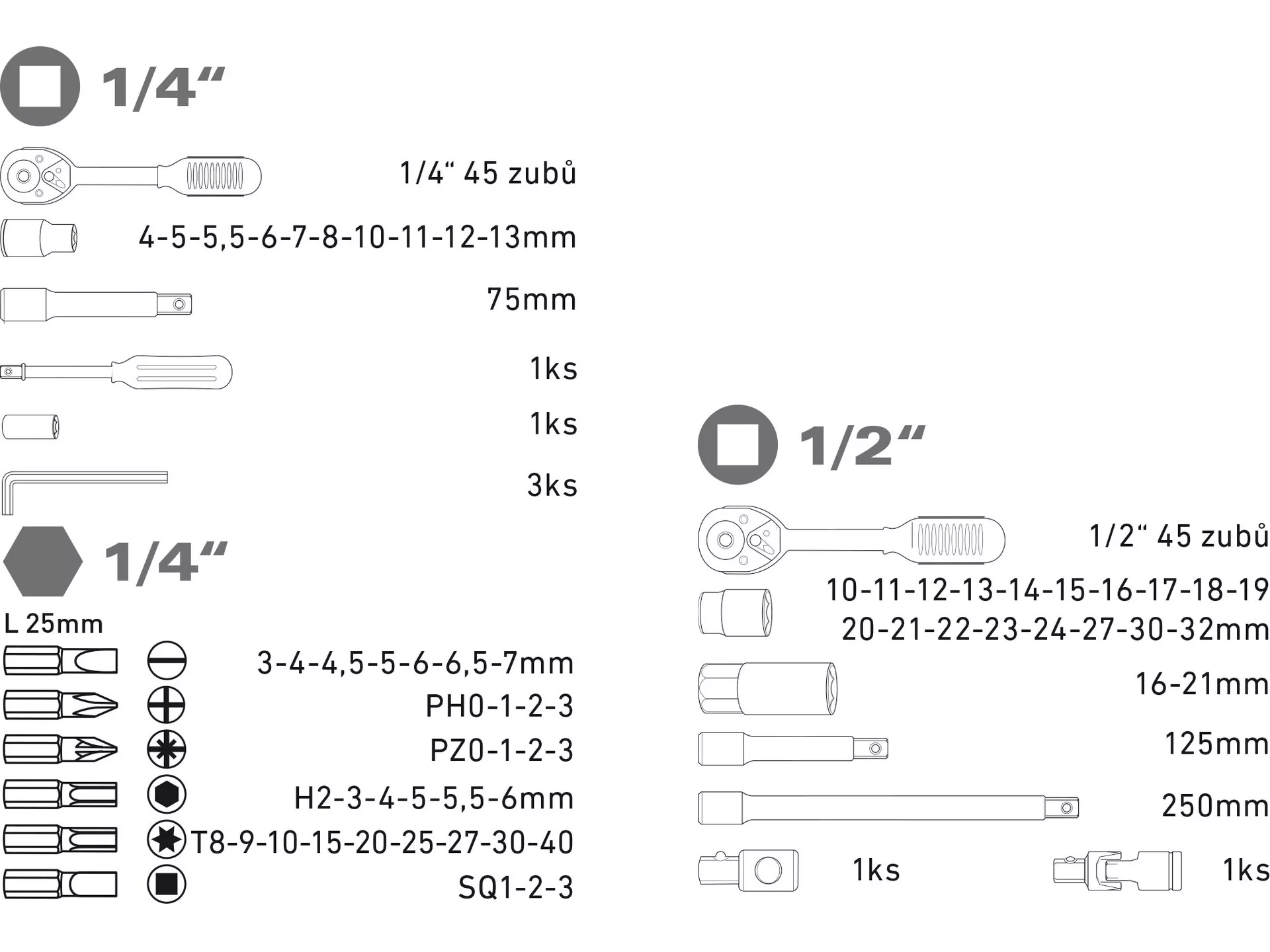 - Hlavice nástrčné: 1/4": 4-5-5,5-6-7-8-10-11-12-13mm, 1/2": 10-11-12-13-14-15-16-17-18-19-20-21-22-23-24-27-30-32mm