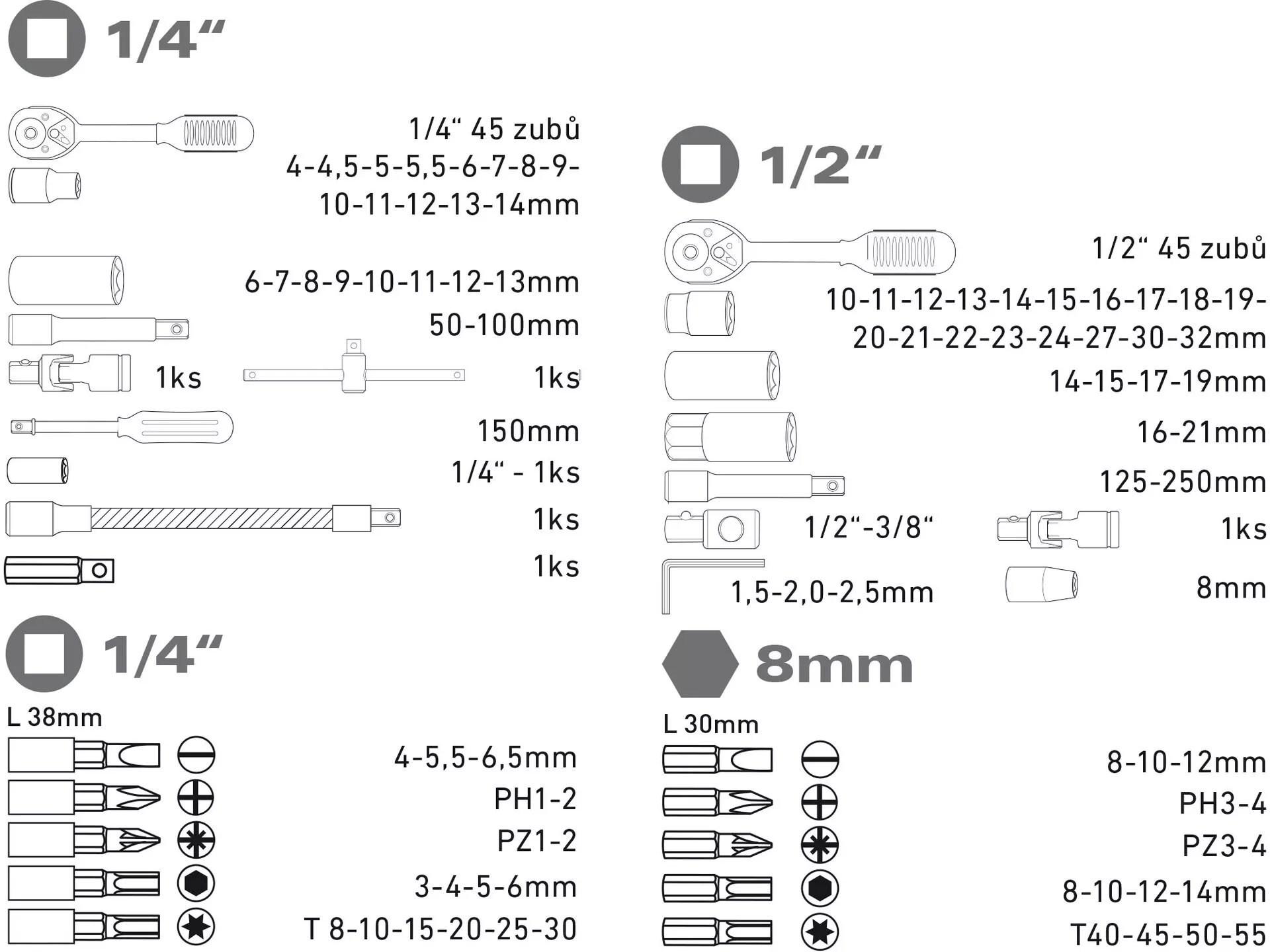 - Hlavice nástrčné: 1/4": 4-4,5-5-5,5-6-7-8-9-10-11-12-13-14mm, 1/2": 10-11-12-13-14-15-16-17-18-19-20-21-22-23-24-27-30-32mm
