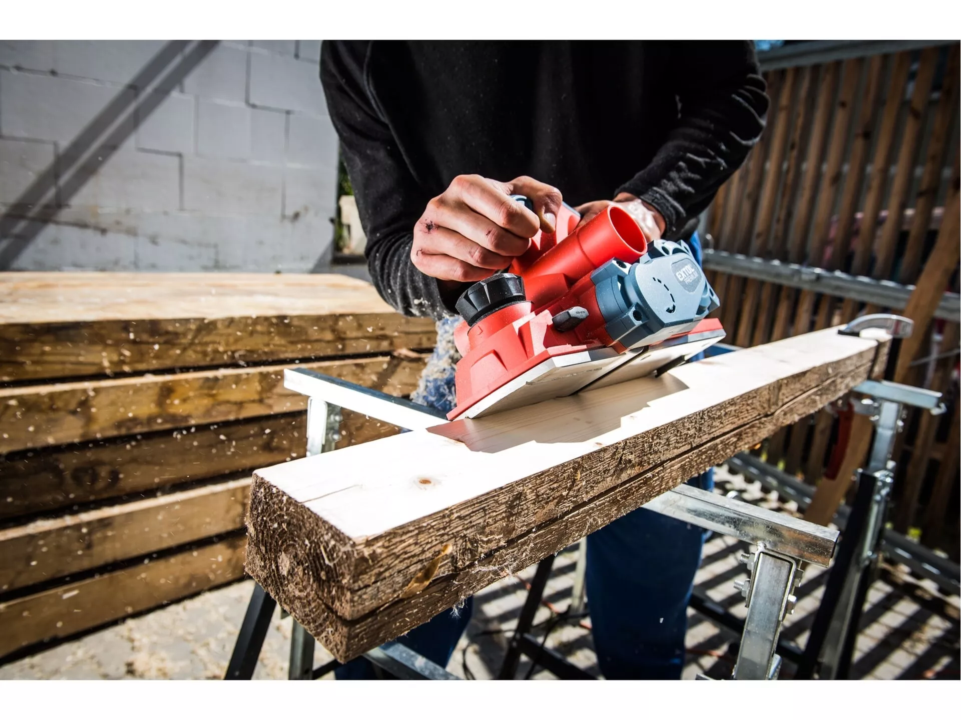 - Velmi silný hoblík s hoblovací šířkou 110mm je určen k hoblování, srážení a drážkování dřeva, např. trámů a prken. Můžete s ním hoblovat 0-3mm při jednom protahu a hloubka úběru se nastavuje po 0,25mm. Při hoblování polodrážek můžete využít rozsah 0 až 8mm. Na hoblovací desce jsou dvě různě hluboké drážky sloužící k jednoduchému srážení hran a sklopný ochranný trn, který chrání při přerušení práce, nože a plochu pod hoblíkem proti poškození. Pokud preferujete práci bez tohoto ochranného trnu, můžete ho jednoduše zajistit v desce, aby se nevyklápěl. Pro udržování čistého pracovního prostoru lze k hoblíku připojit odsávání z pravé nebo levé strany.