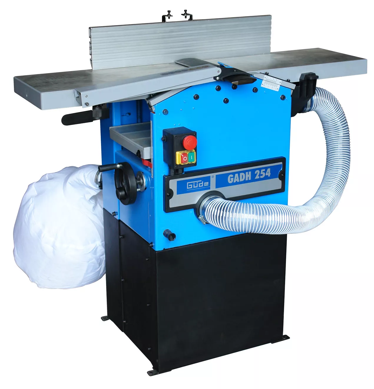 - Konstrukce: hliníkový srovnávací stůl (-> d x š: 1.050 x 260 mm), nerezový protahovací stůl (-> d x š: 480 x 254 mm), profesionální nožová hřídel s HSS řeznými noži (2), ochranný kryt nožové hřídele, uzavřený skříňový podstavec s otvory (4) pro montáž napevno