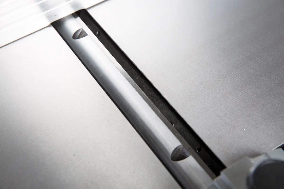 - Snadno nastavitelný hliníkový doraz pro srovnávání, lze jej naklopit v rozsahu 90° až +45°