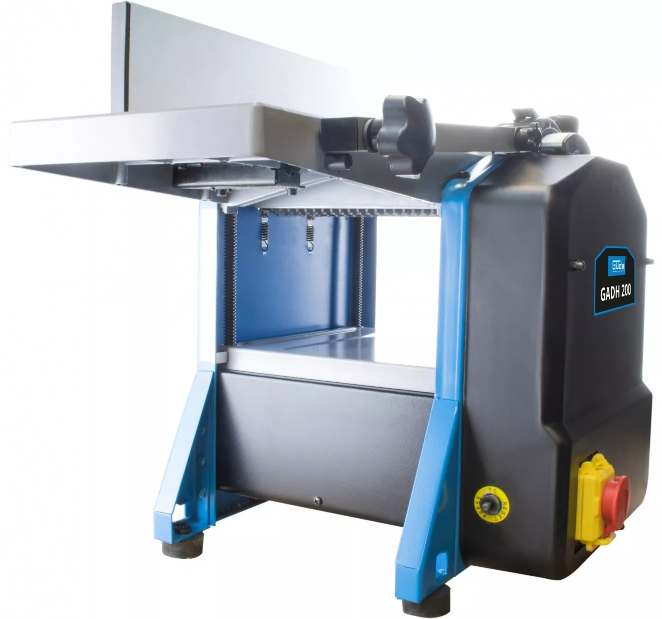 - Konstrukce: hliníkový hoblovací stůl (-> d x š: 737 x 210 mm), ochranný kryt nožové hřídele, výsuvná opěrka obrobku, HSS řezné nože (2), přípojka odsávání, stojné nožky s gumovými patkami