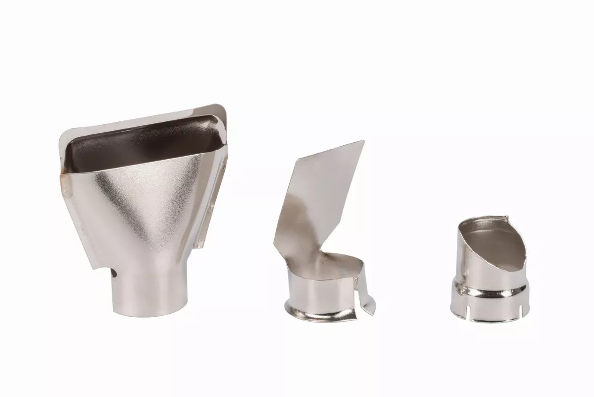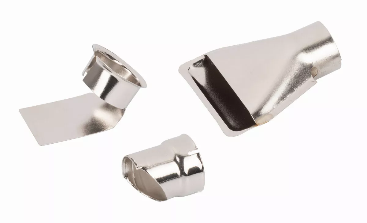 - Tato horkovzdušná pistole se dodává se 3 tryskami: - Jedna rozptylovací tryska, která šíří teplo - Jedna tryska na ochranu skla - Jedna redukční tryska pro koncentraci tepla