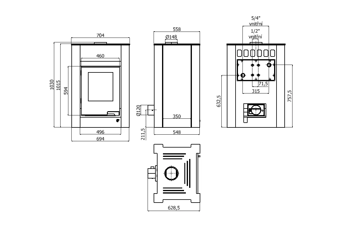 - Typ kamen: teplovodní, dvouplášťová, konvekční
