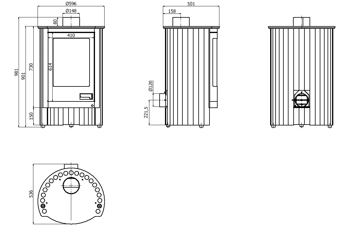 - Vývod spalin: 150 mm