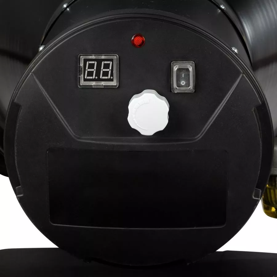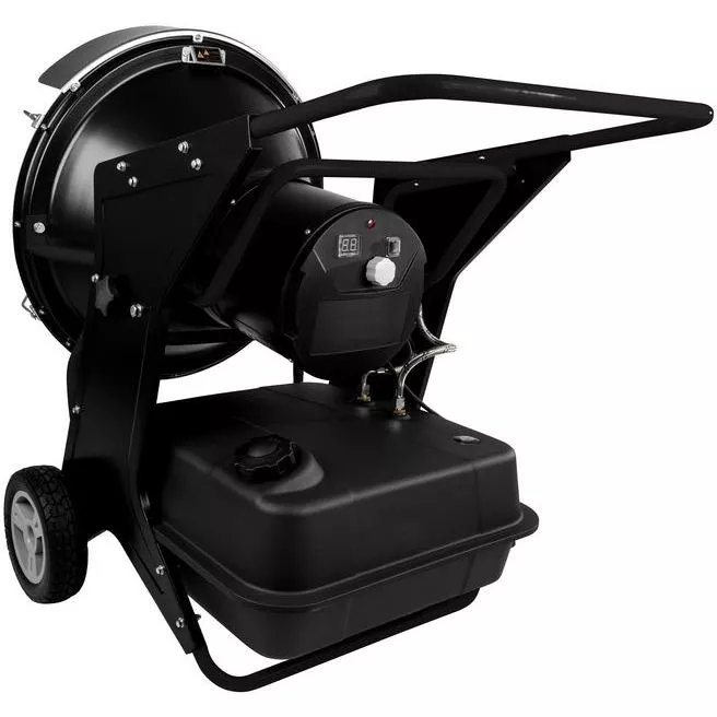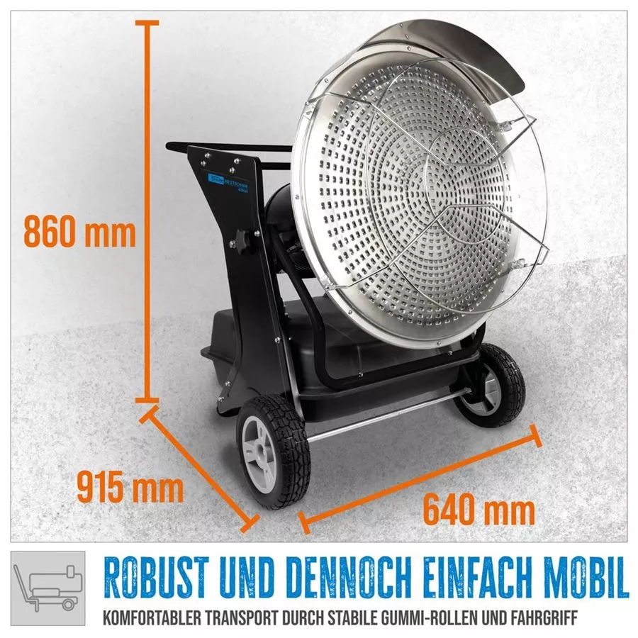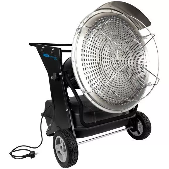 - rozlehlých otevřených i zastřešených objektů a budov • vysoušení omítnutých stěn a nátěrů • rozmrazování strojů nebo potrubí • náhradní zdroj tepla v případě havárií. Přesné nastavení potřebné teploty na displeji (termostatu) • prostorový termostat, udržující zvolenou teplotu automatickým zapínáním (vypínáním) hořáku • kontrola plamene fotoelektrickým čidlem • pojistka proti přehřátí.Konstrukce: kovový plášť, spalovací komora ze žáruvzdorných keramických vláken, elektronické zapalování, ukazatel stavu paliva, trubkový rám s podvozkem. Celkové rozměry (d x š x v): 925 x 640 x 860 mm, spotřeba: 3,9 l/hod, hladina akustického výkonu LWA: 67 dB (A), stupeň krytí: IP X4.