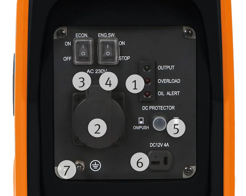 - Kontrolky výstupního napětí, přetížení a nedostatku oleje