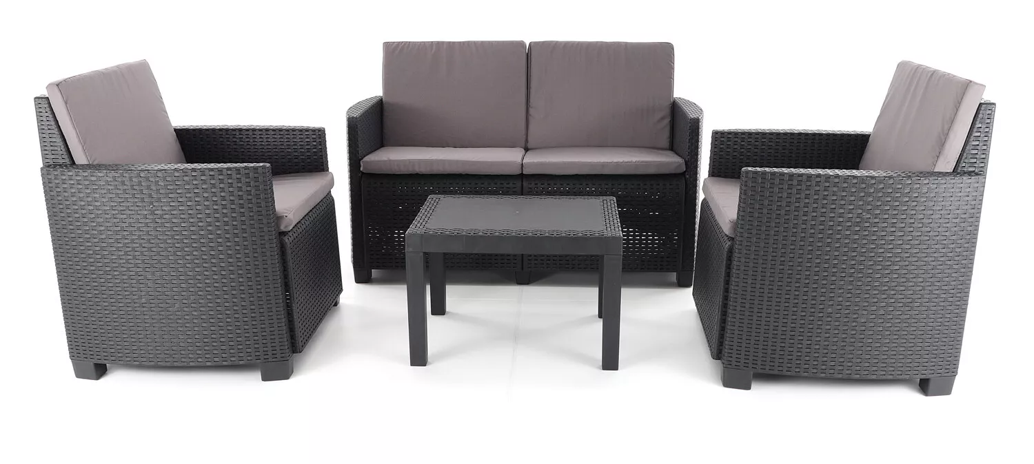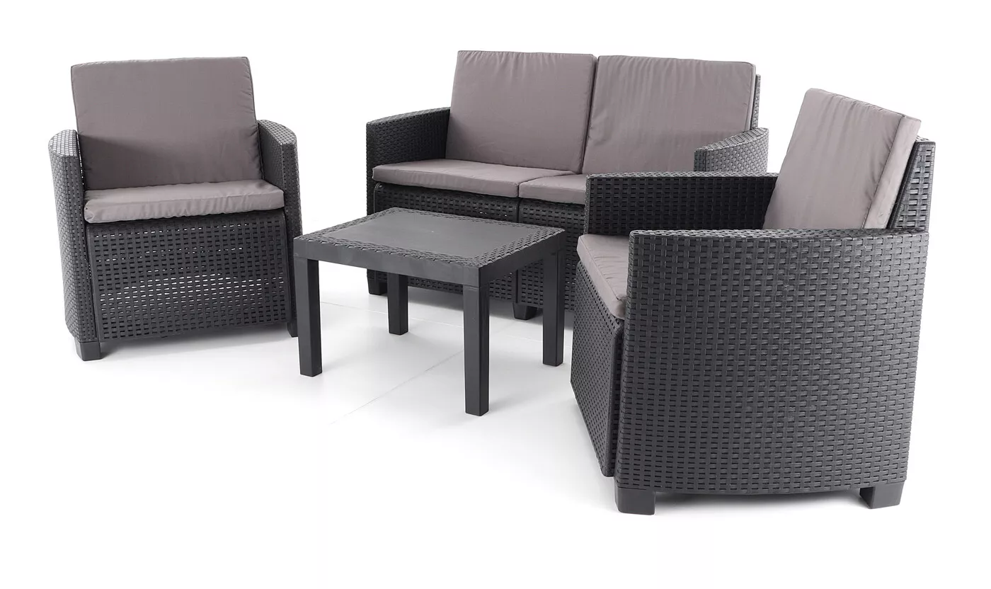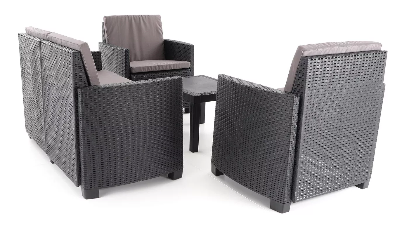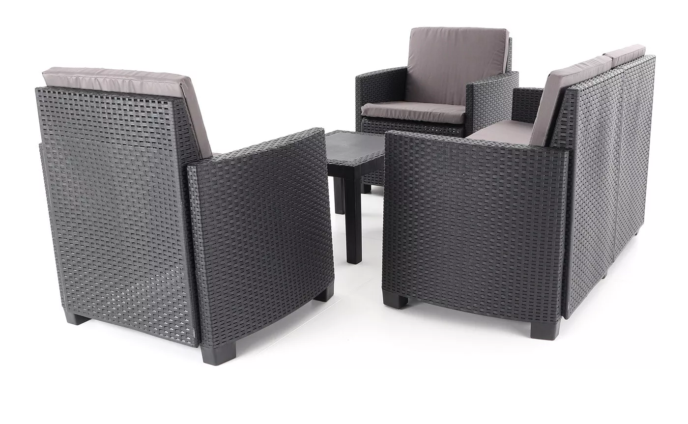 - Stolová sestava se skládá ze 2 pohodlných křesel, lavice a stolku v imitaci umělého ratanu s UV filtrem.