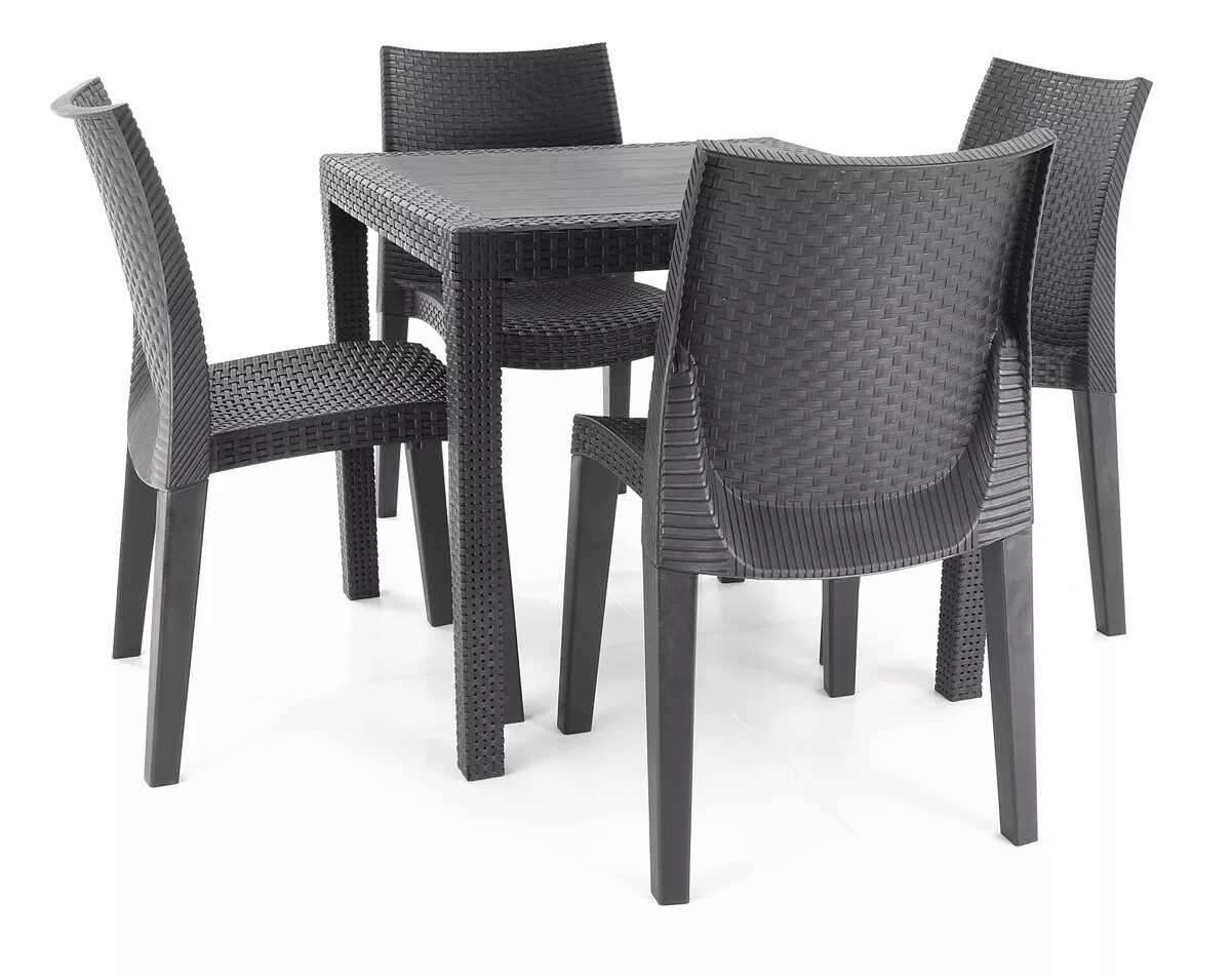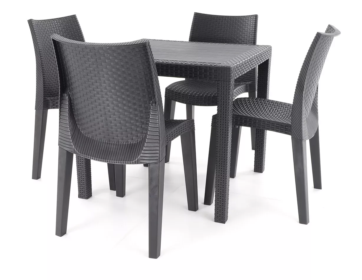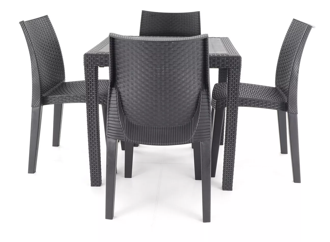 - Stolová sestava se skládá ze 4 pohodlných masivně vyztužených židlí a stolu v imitaci umělého ratanu s UV filtrem.
