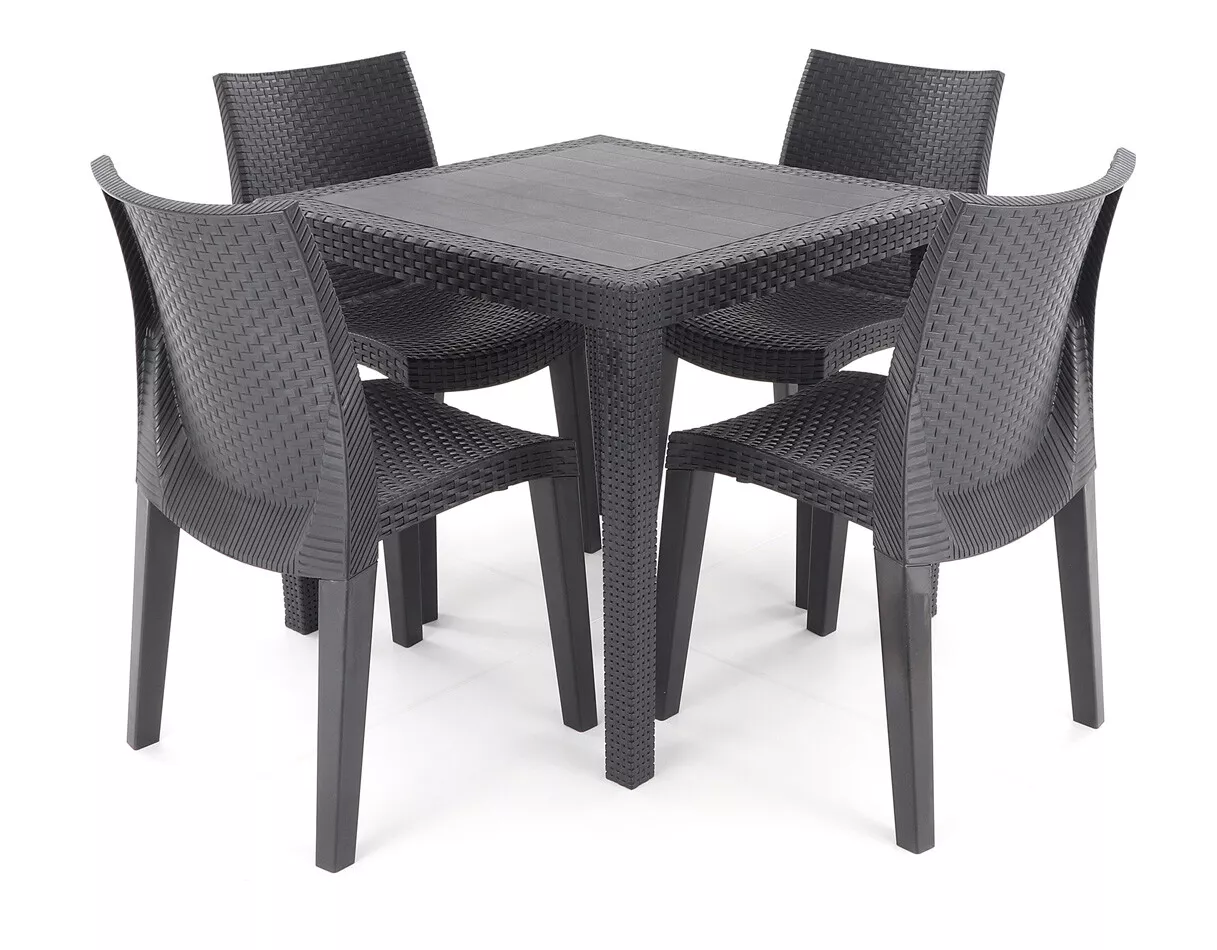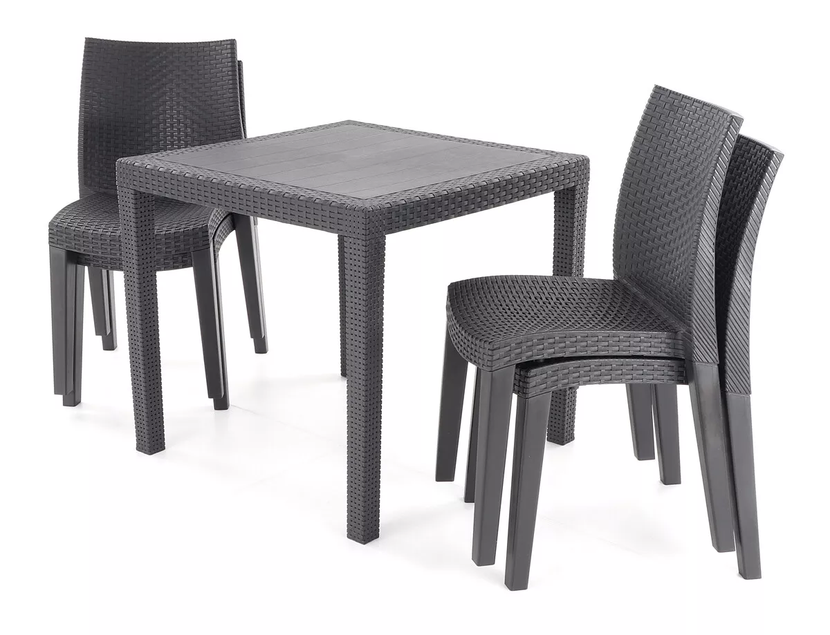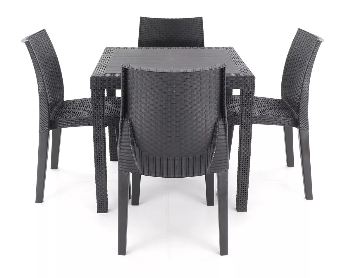 - Stůl je ve tvaru čtverce, také v imitaci umělého ratanu s UV filtrem.
