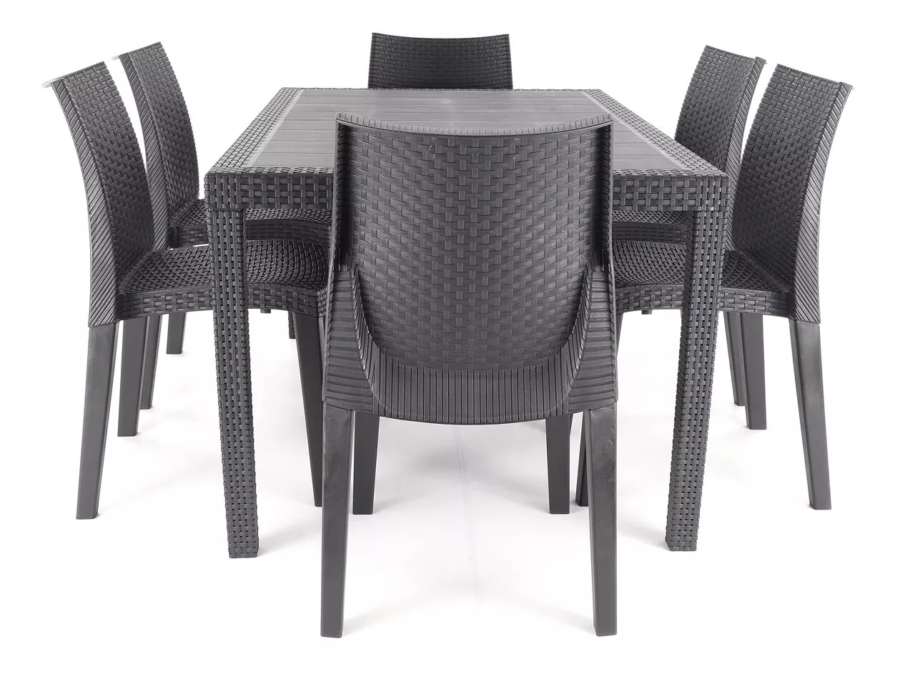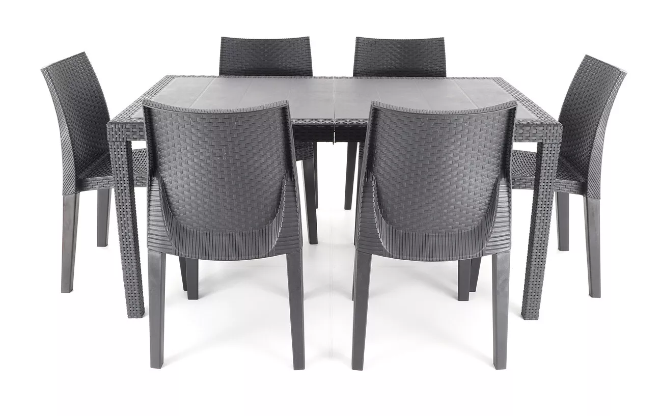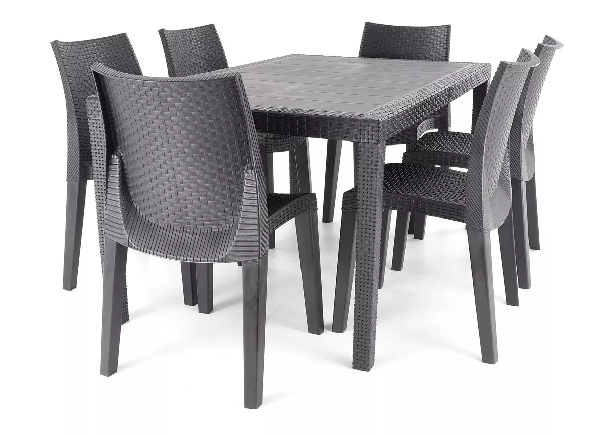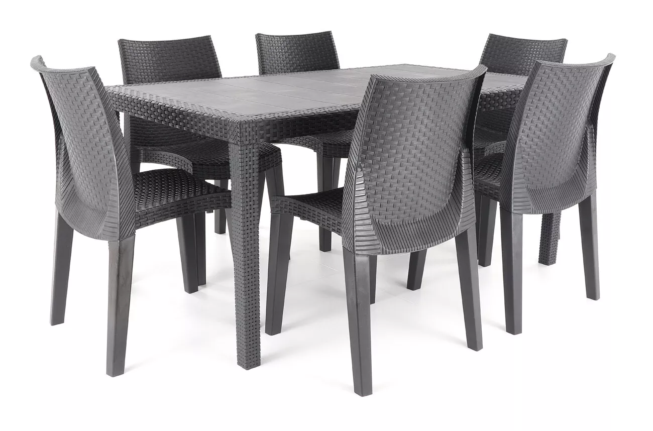- Stolová sestava se skládá ze 6 pohodlných masivně vyztužených židlí a stolu v imitaci umělého ratanu s UV filtrem.