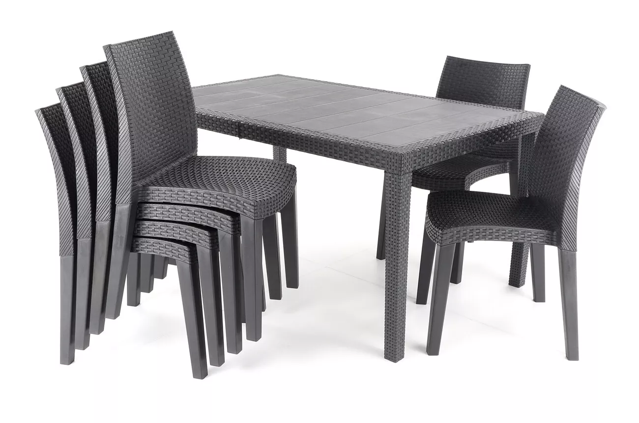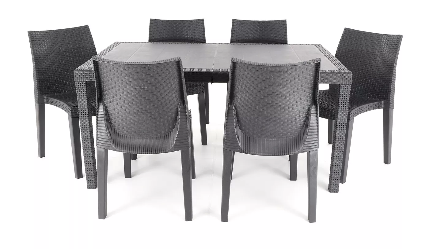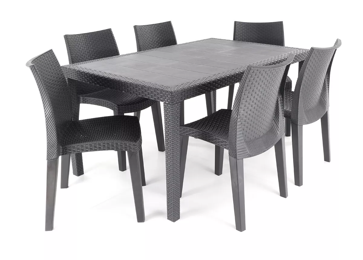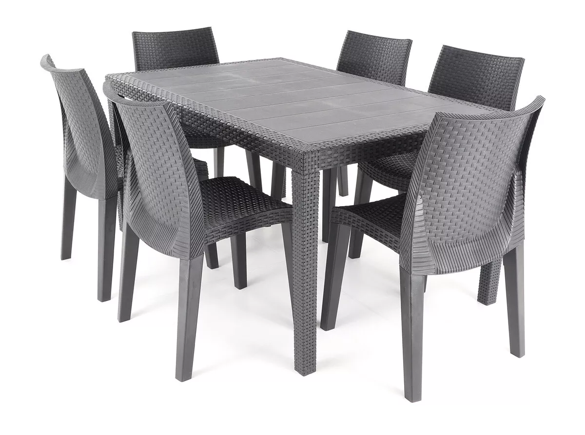 - Stolová sestava se skládá ze 6 pohodlných masivně vyztužených židlí a stolu v imitaci umělého ratanu s UV filtrem.