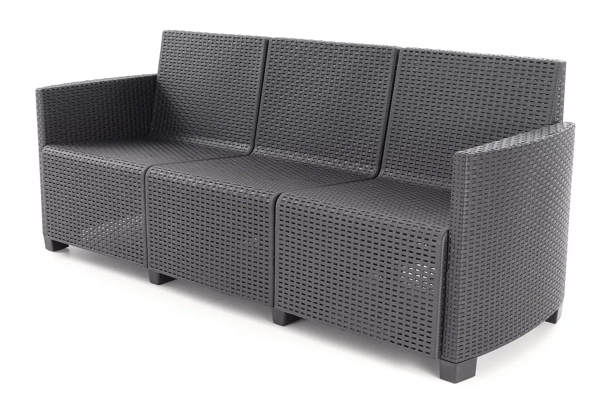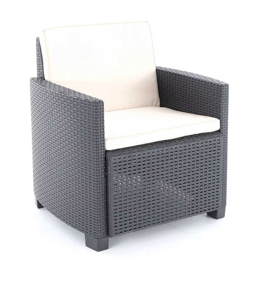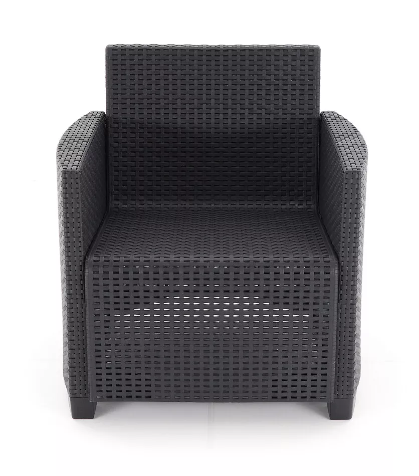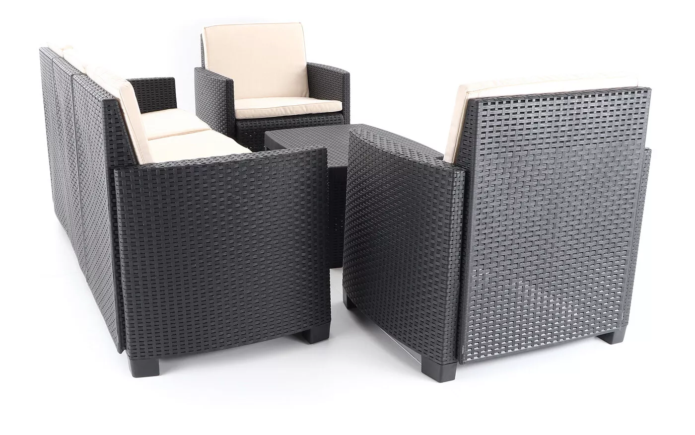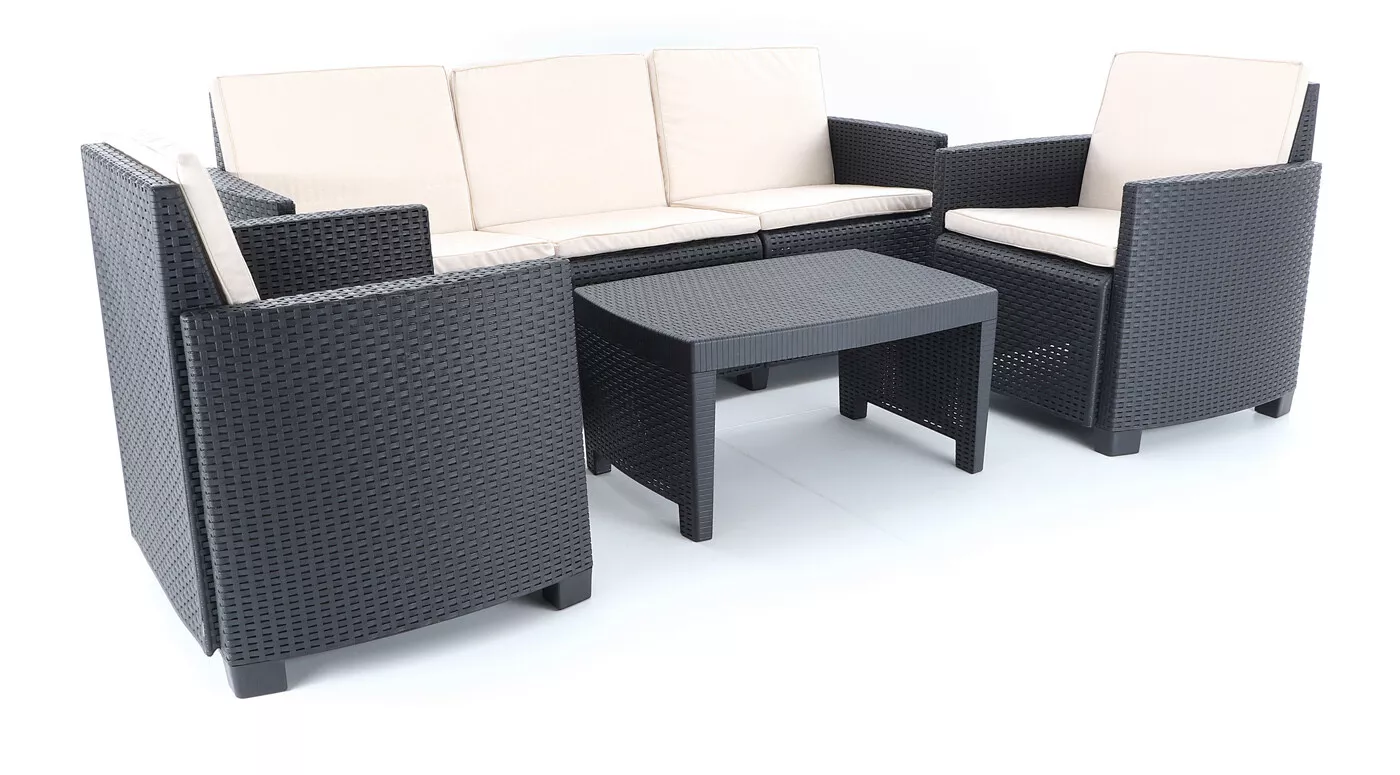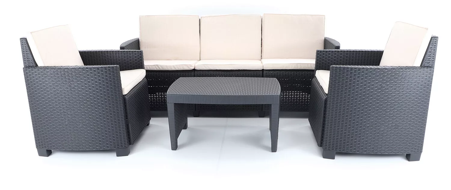 - Stolová sestava se skládá ze 2 pohodlných křesel, třímístné lavice a stolku v imitaci umělého ratanu s UV filtrem.