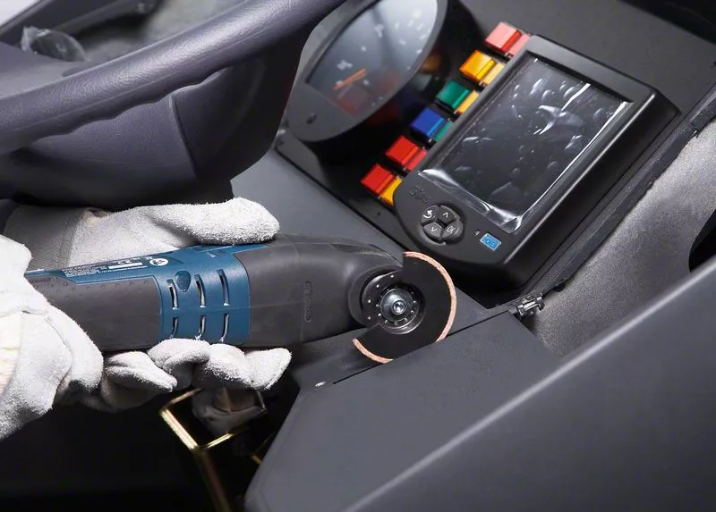 - Špičaté konce segmentového pilového kotouče umožňují řezání v úzkých rozích, zatímco kruhová konstrukce umožňuje přímé vedení řezu.