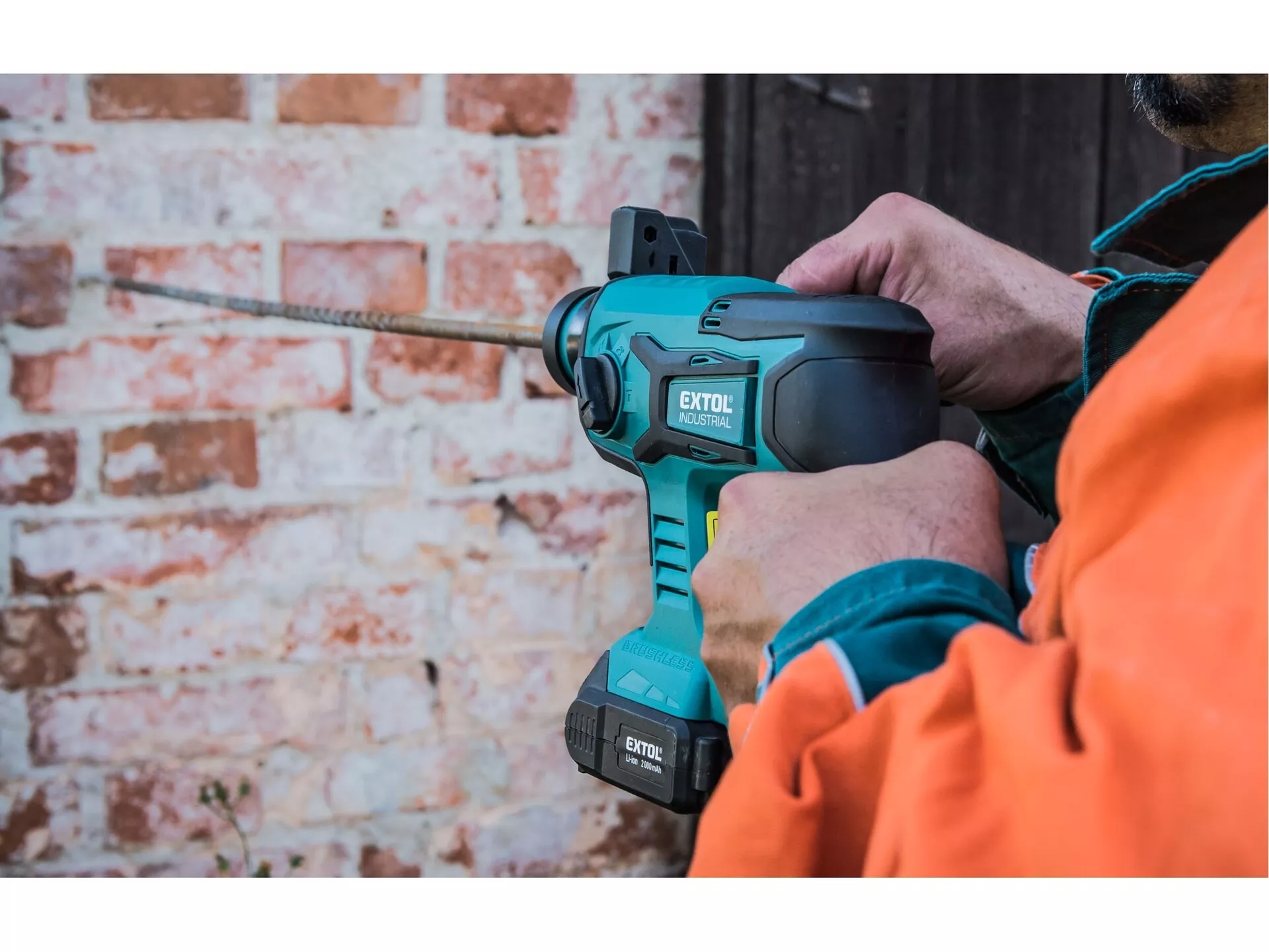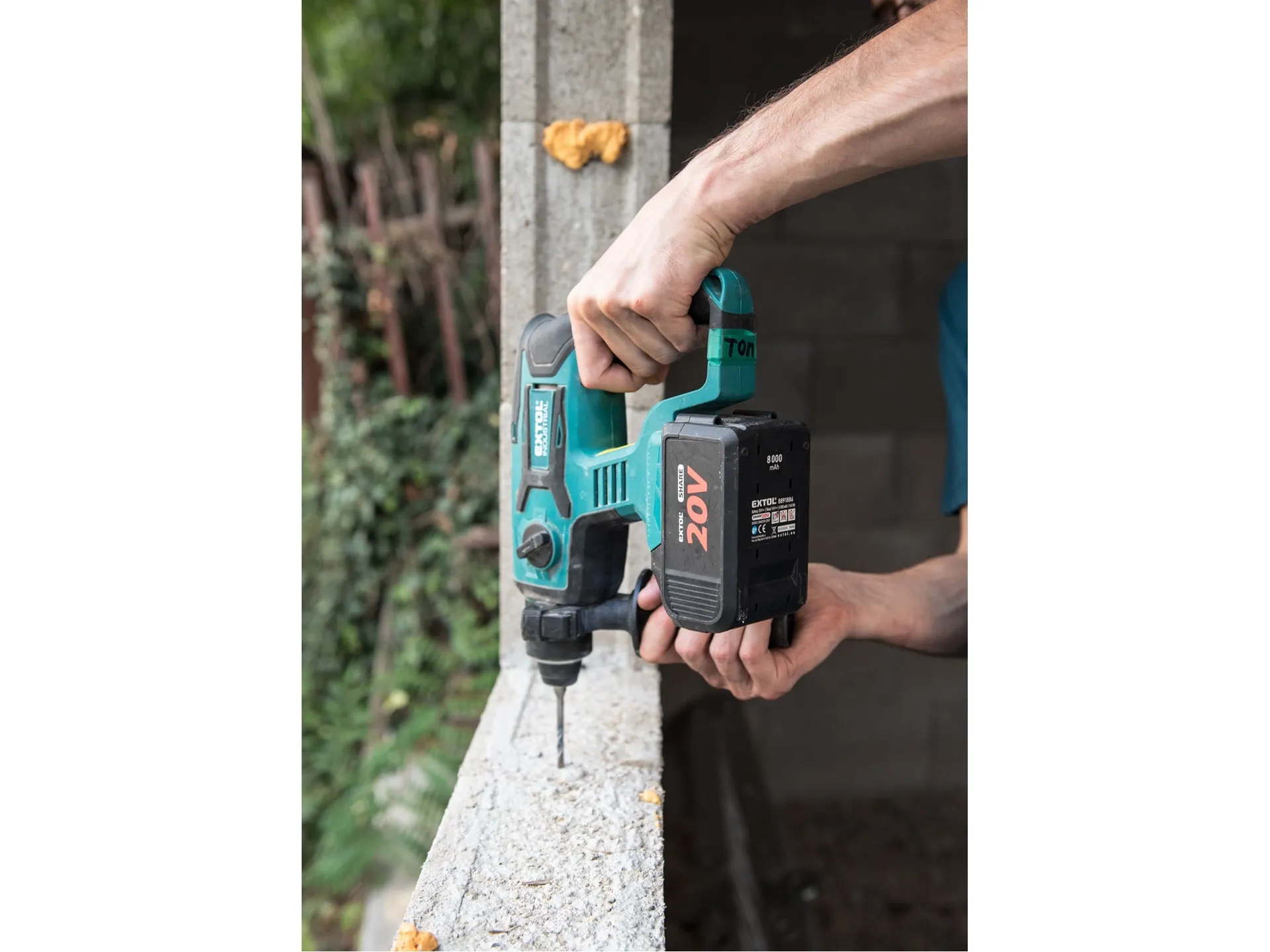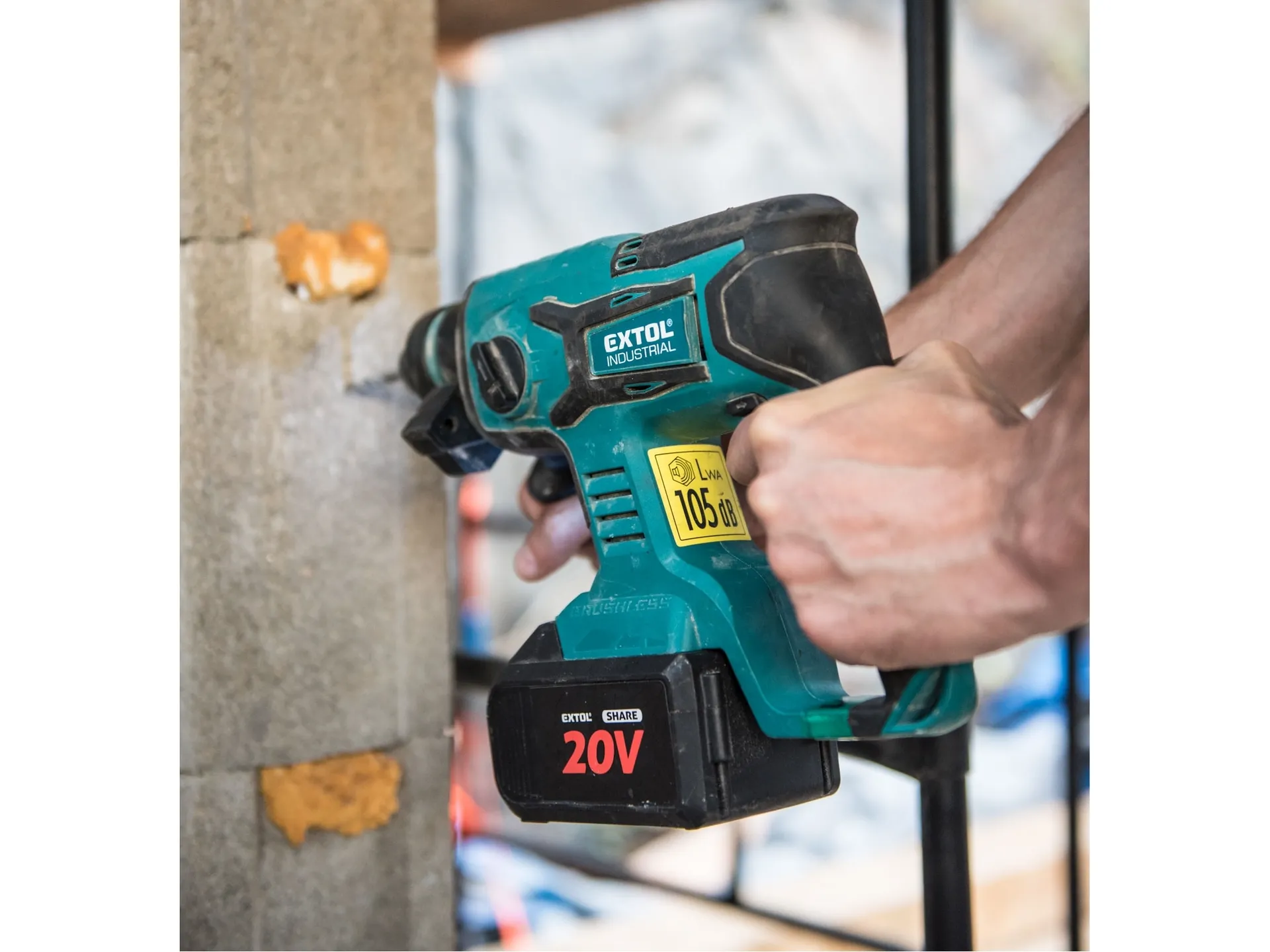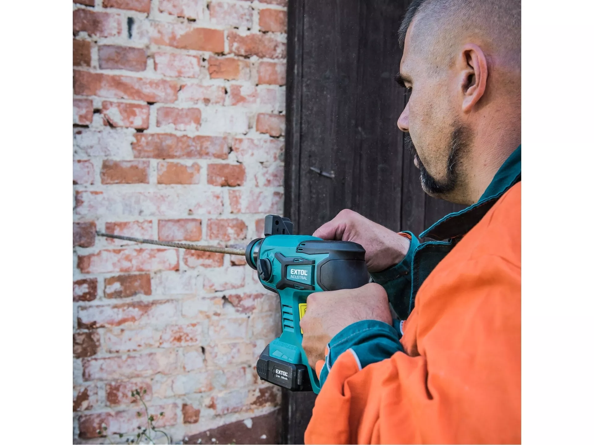 - Aku vrtací kladivo je určeno k rychlému vrtání do cihel a betonu pomocí vrtáků s SDS plus stopkou a menším sekacím pracem. Kladivo je poháněno nejmodernějším „brushless" motorem. Tento nový typ motoru má vyšší životnost, je výkonnější a má menší spotřebu el. energie než klasické motory s uhlíkovými kartáči. Díky pneumatickému příklepovému systému je schopno vrtat mnohem rychleji a efektivněji než příklepové vrtačky. Kladivo má zámek sekáče, takže si můžete před sekáním sekáč nastavit do patřičné polohy a při sekání bude kladivo udržovat sekáč v této poloze. Jeho hlavní výhodou je akumulátorový pohon, který dovoluje si vzít kladivo s sebou tam kde s ním potřebujete pracovat, bez ohledu na to, jestli tam je rozvod elektrické energie. Kladivo je vybaveno zpětným chodem pro snadné vytažení zaseklého vrtáku a regulací rychlosti, kterou lze využít dle vrtaného materiálu. Integrované LED osvětlení má zpožděné vypnutí a svítí ještě několik vteřin po vypnutí kladiva. Pro běžnou práci dostačují jeden nebo dva 2000mAh akumulátory, které můžete rychle nabít v rychlonabíječce, pro náročnější nebo delší práci doporučujeme větší akumulátory s kapacitou 4000–8000mAh. Akumulátor lze použít ve všech typech nářadí řady EXTOL SHARE20V. Díky použité Li-ion technologii je ho možné kdykoliv dobíjet, aniž by se tím snižovala jeho kapacita. Li-ion akumulátor ztrácí energii vlivem samovybíjení velmi pomalu a vydrží dlouho nabitý a připravený k použití.