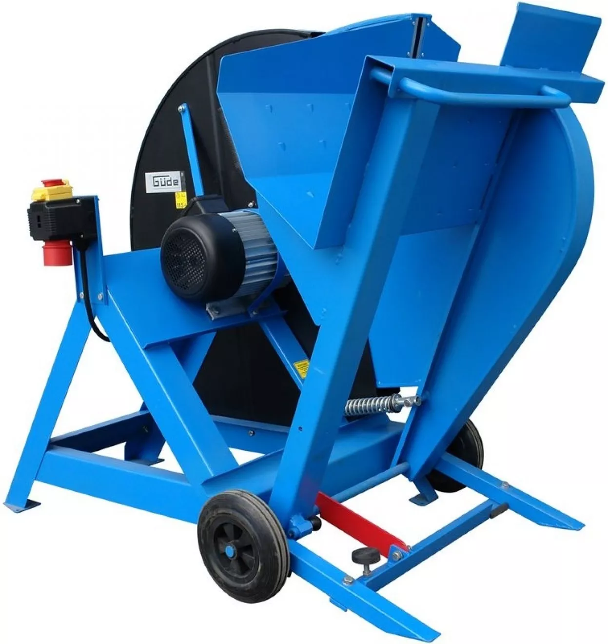 - Konstrukce: stabilní ocelový rám, robustní kryt pilového kotouče, ergonomicky tvarovaná kolébka s hroty proti protáčení řezaného materiálu/madlem pro bezpečné navádění, transportní podvozek s celogumovými pojezdovými koly, kovové části s povrchovou