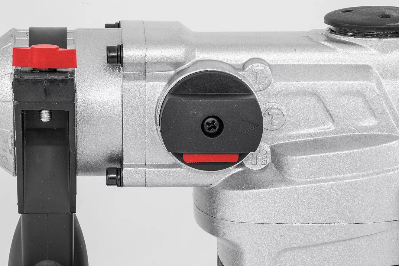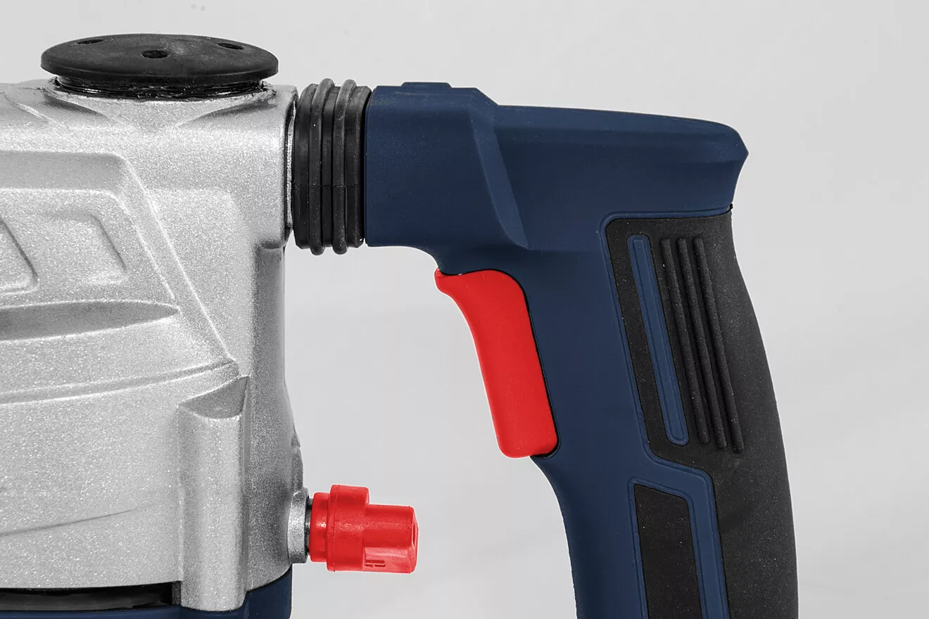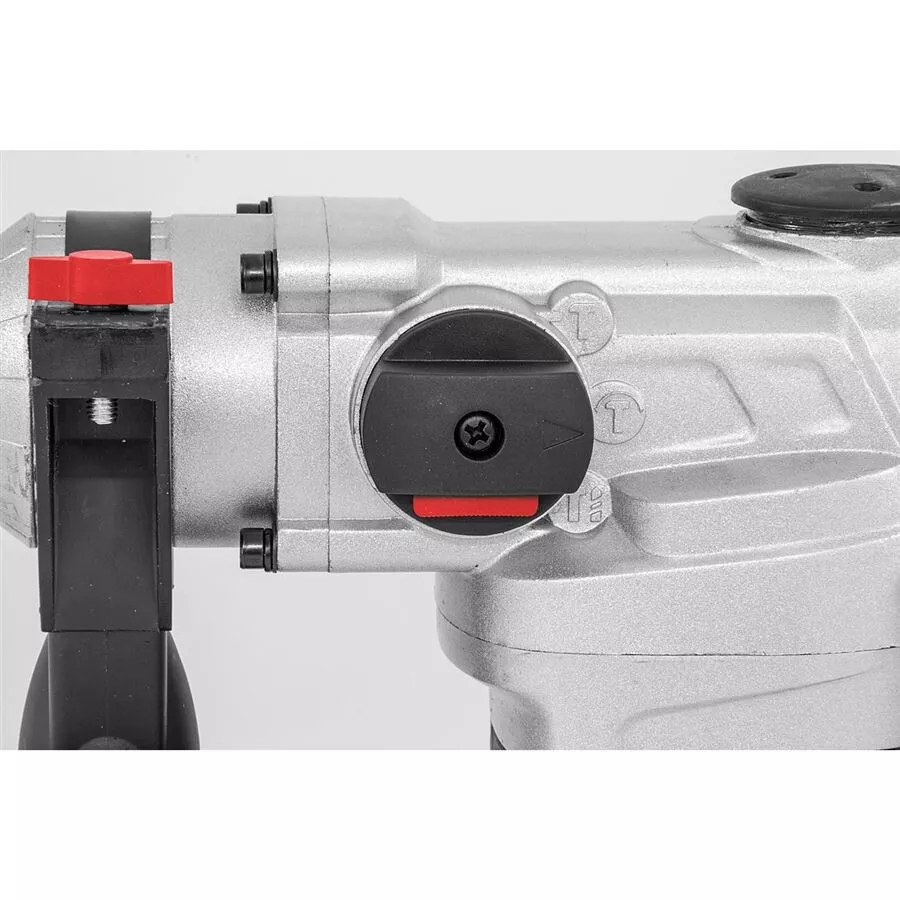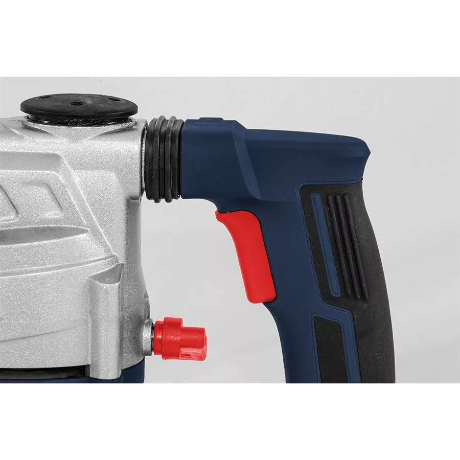 - Konstrukce: rychloupínací sklíčidlo SDS-plus, hloubkový doraz, protiprachová krytka, ergonomicky tvarovaná rukojeť s tlumicí vložkou a indikátorem napětí (-> LED dioda), otočné boční držadlo