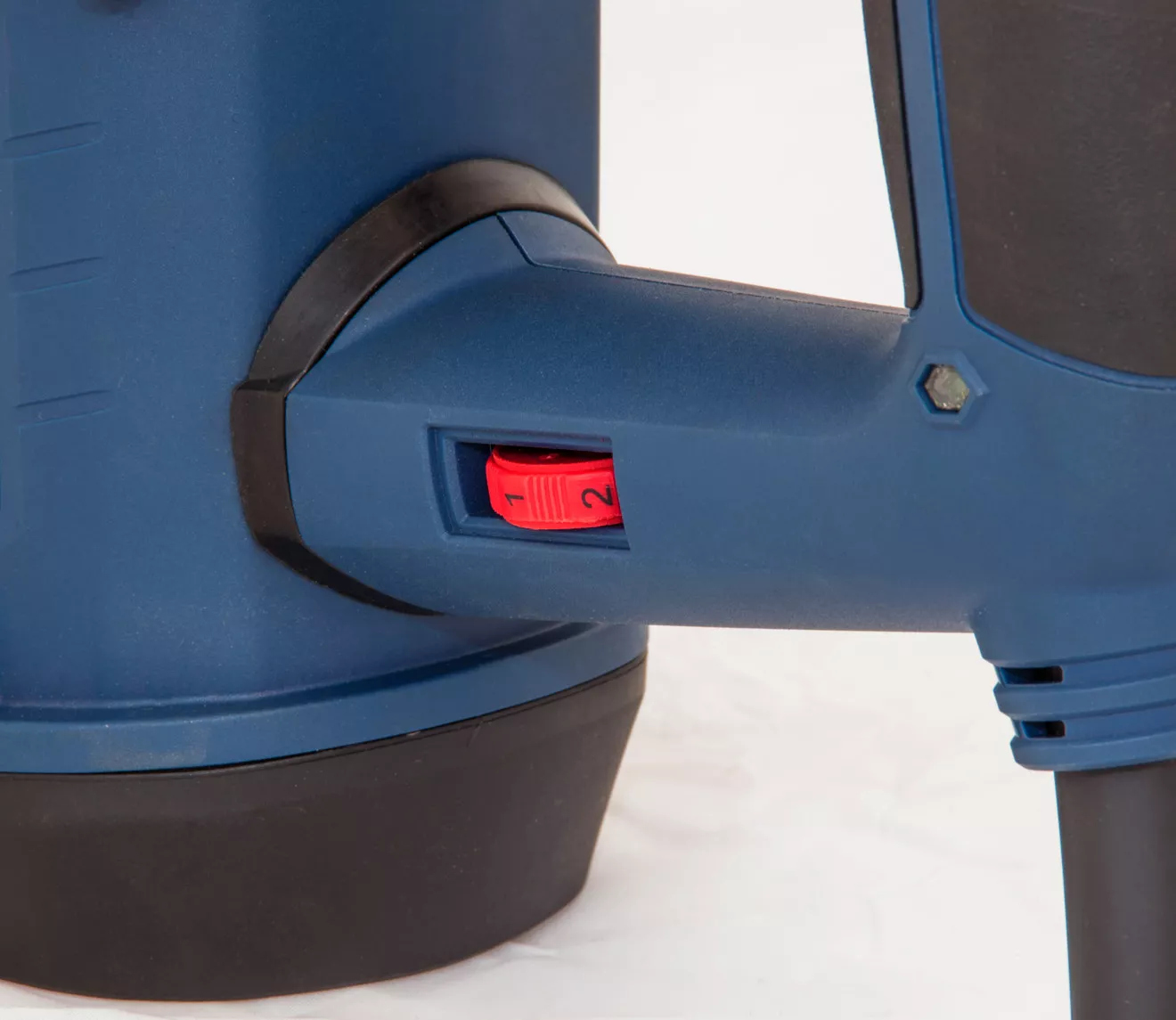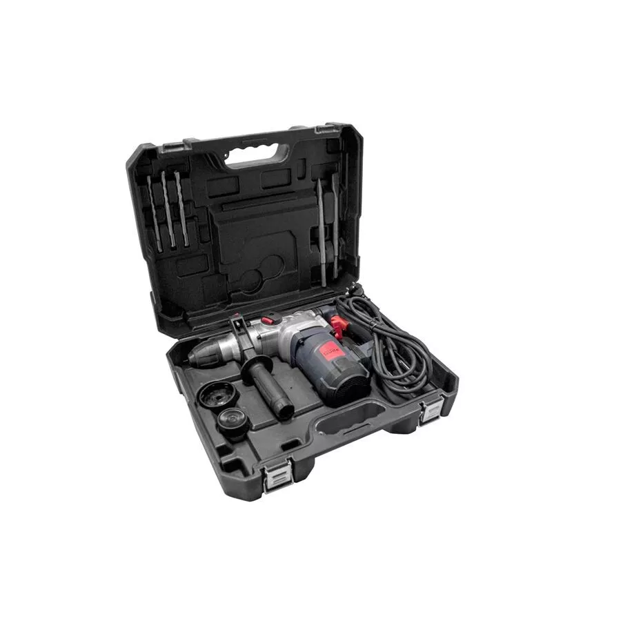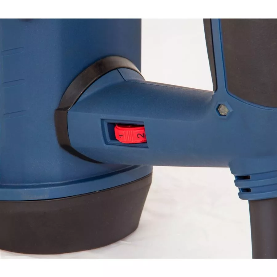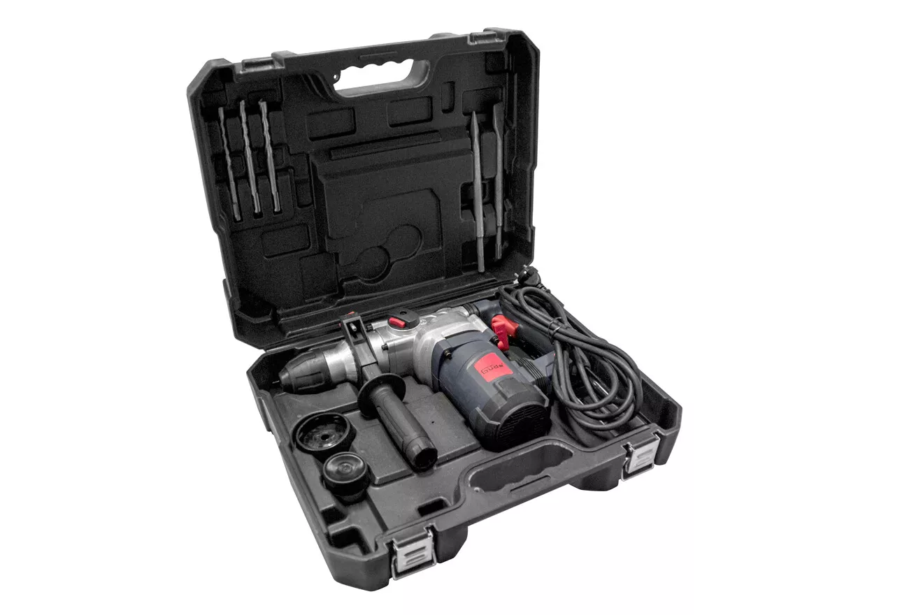 - Konstrukce: rychloupínací sklíčidlo SDS-plus, hloubkový doraz, protiprachová krytka, ergonomicky tvarovaná rukojeť s tlumicí vložkou a indikátorem napětí (-> LED dioda), otočné boční držadlo