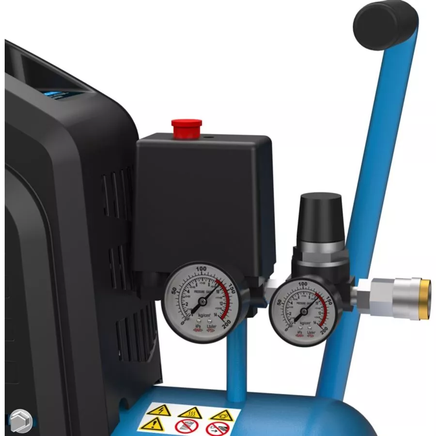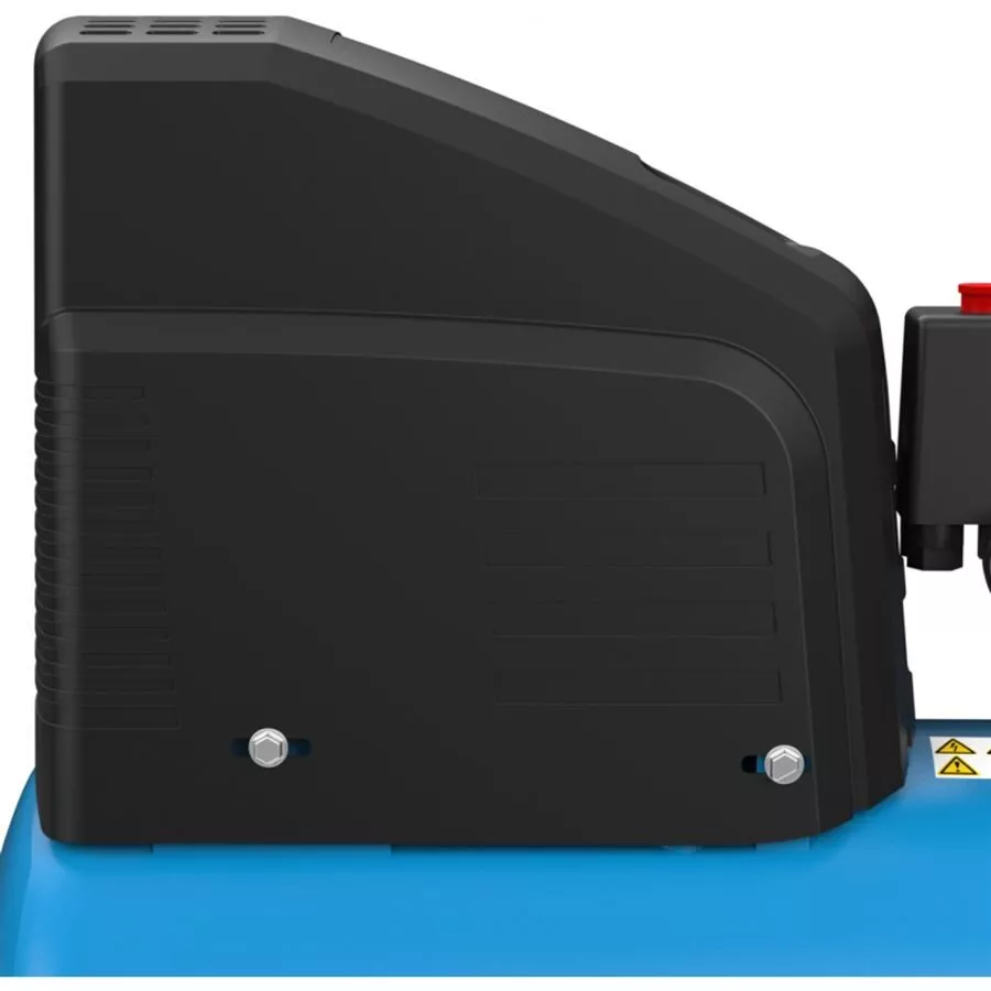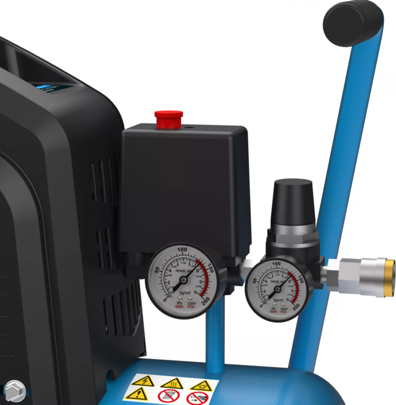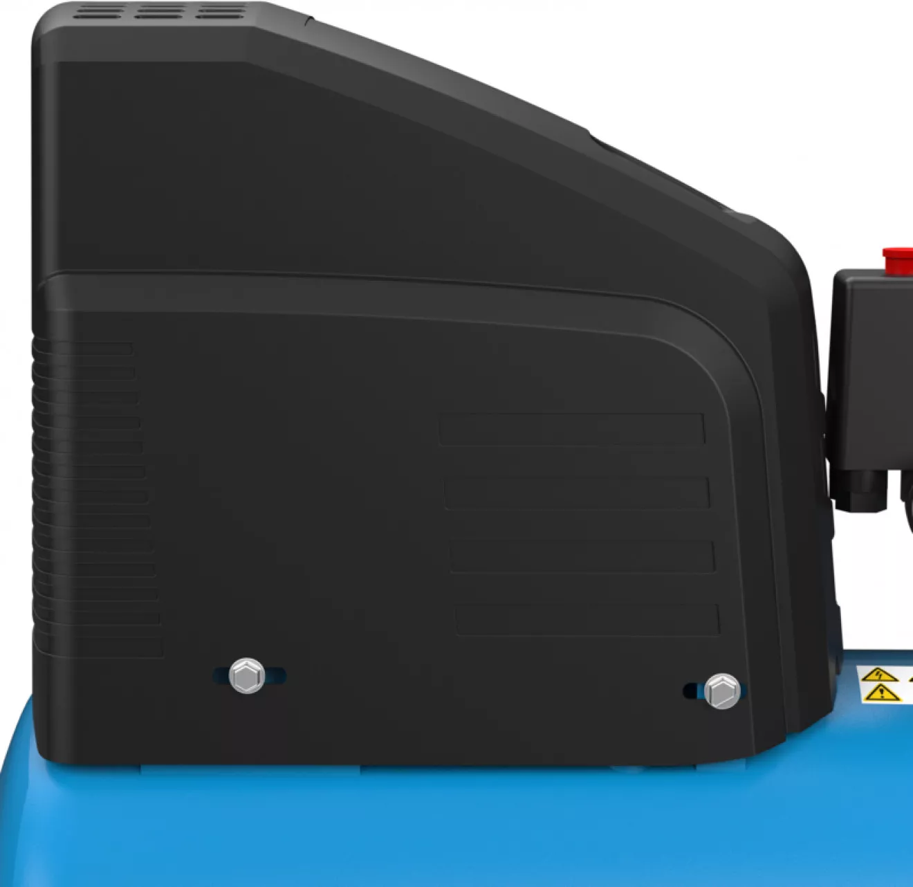 - Vybavení: 2 manometry, 1 výstup stlačeného vzduchu (kovová rychlospojka), tlakový spínač, redukční ventil, pojistný přetlakový ventil, zpětný ventil, vzduchový filtr, 1,5 m síťový kabel H05 VV-F.