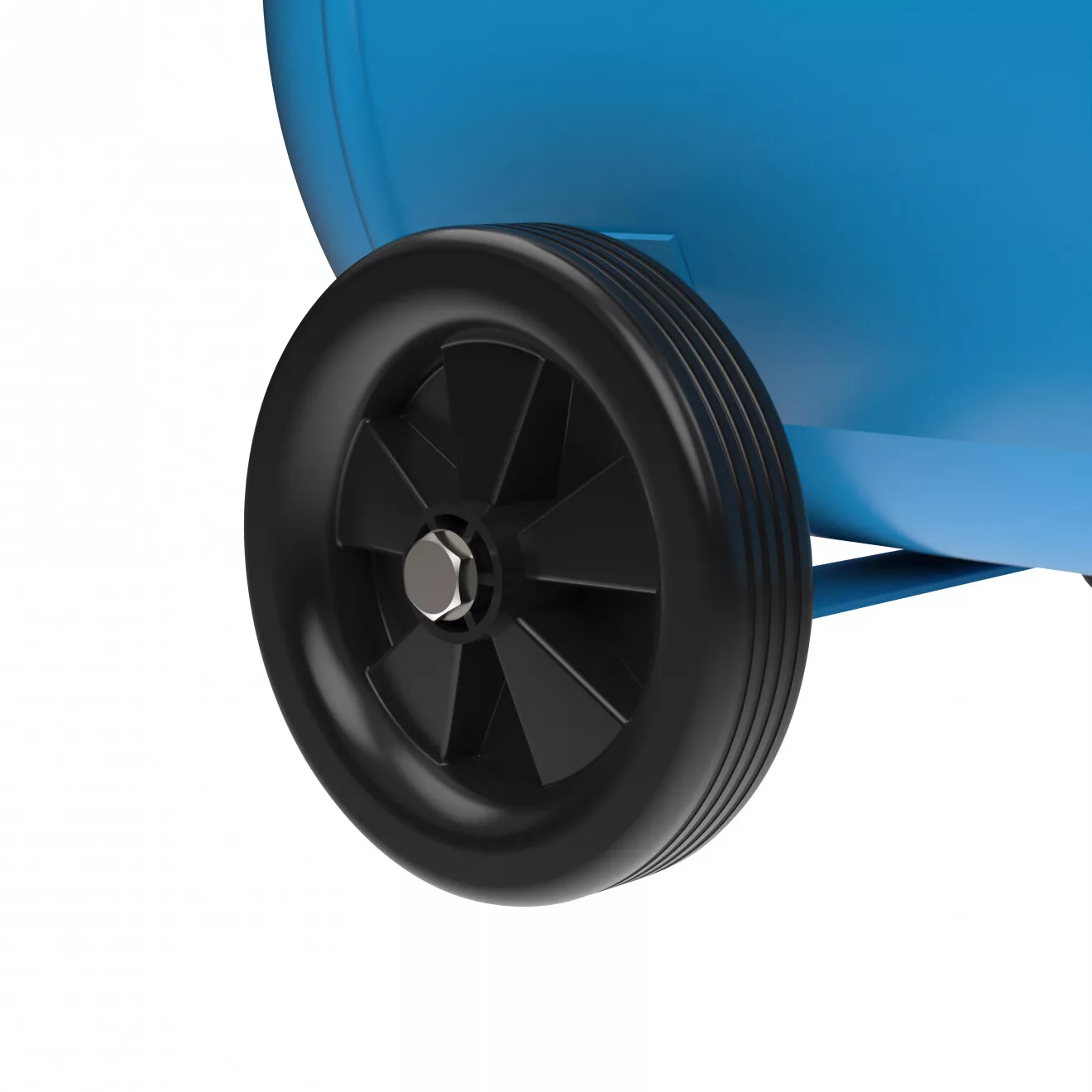 - Tlaková nádoba: 50 l, vypouštěcí ventil kondenzátu, opěrky s gumovými patkami (2), transportní rukojeť, celoplastová kola pro snadné přejíždění
