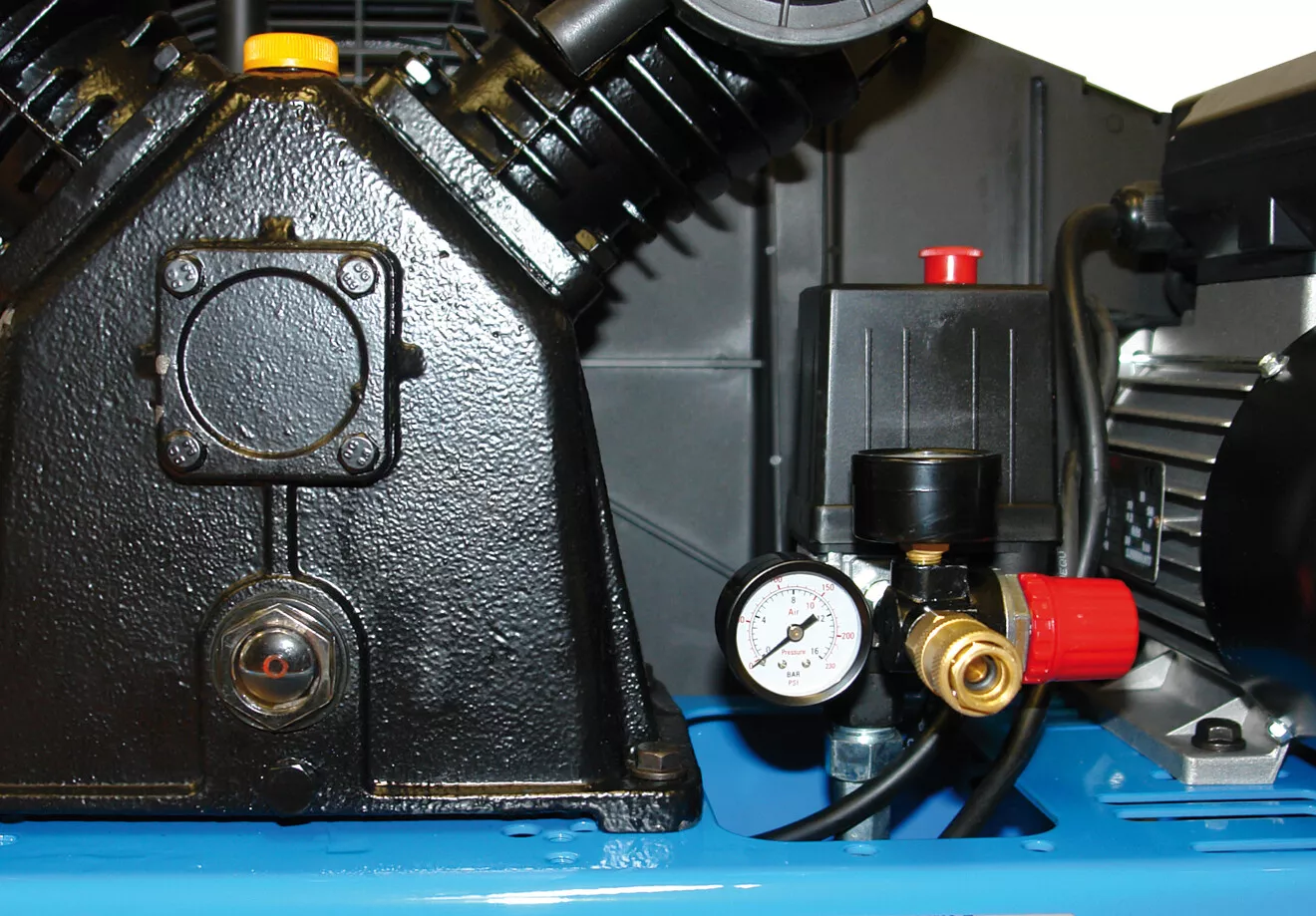 - Konstrukce: elektromotor 2,2 kW (-> včetně proudové ochrany, typ provozu: S3/60%), dvouválcový „V“ agregát s olejovým mazáním, řemenový pohon, řemenice s lopatkami pro optimální chlazení agregátu, velký kryt jako garance bezpečné práce se strojem